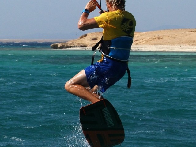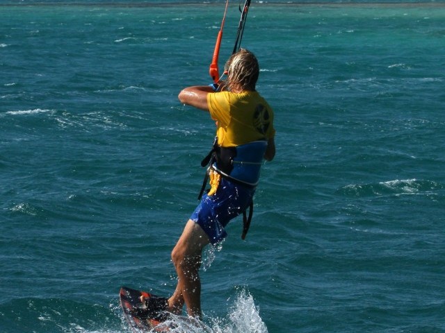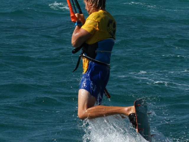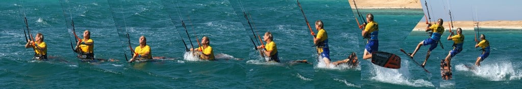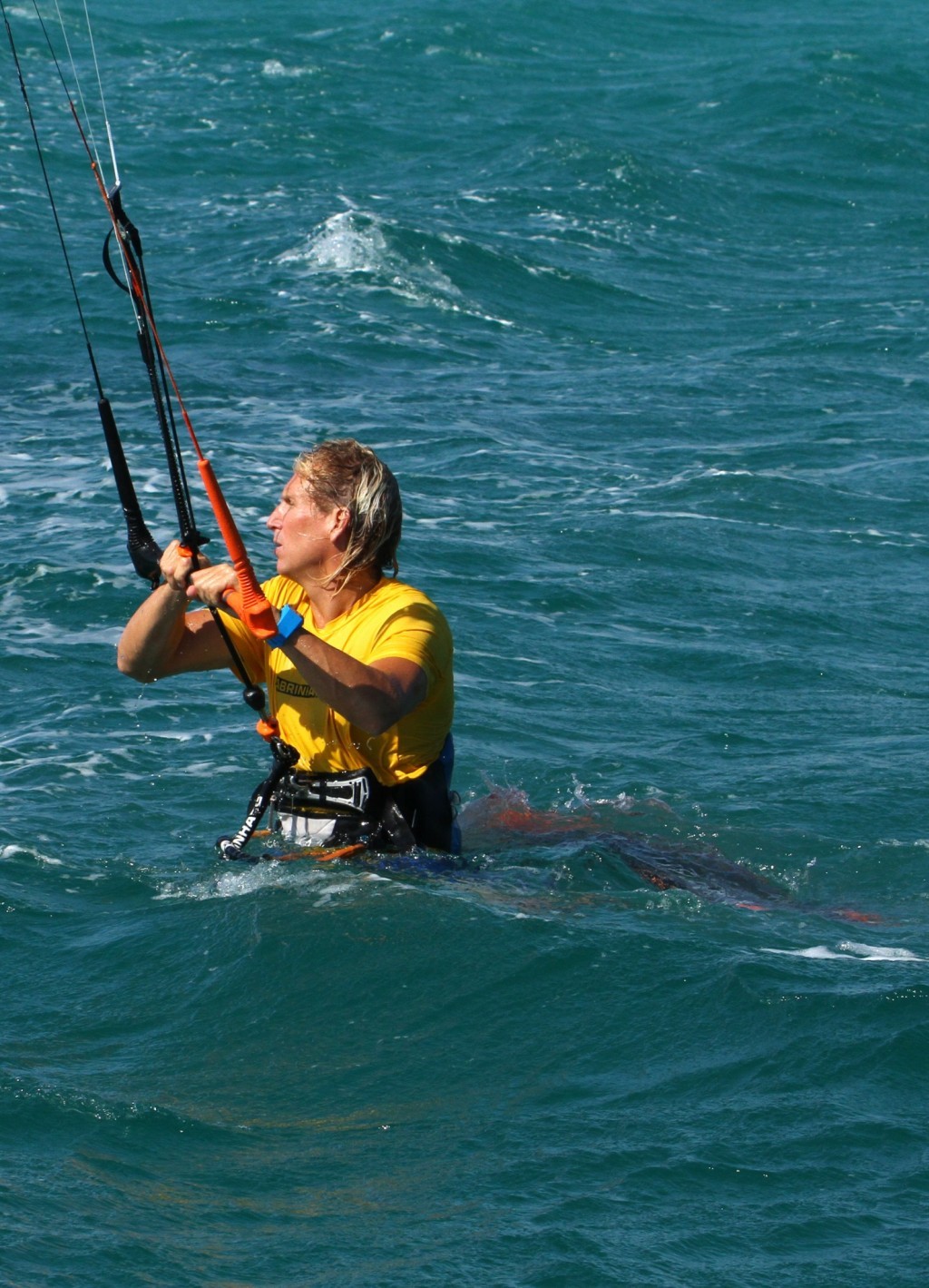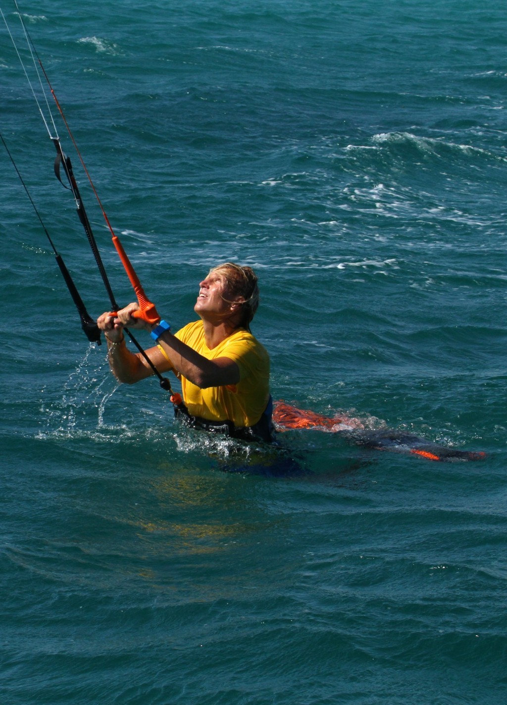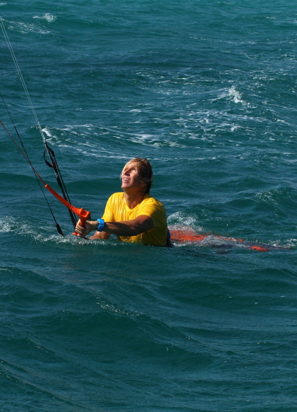 If you look at this pic, it’s a continuation of the last point. Christian has given the kite the command to move with meaning, and he’s watching it like a hawk to make sure that it turns fast but goes up over 12 rather than overdoing it and diving it down. In this scene 12 is your magic number. With the kite going over and past 12 the kite is already lifting Christian so his upper body raises out of the water. This moment of lift is your cue…