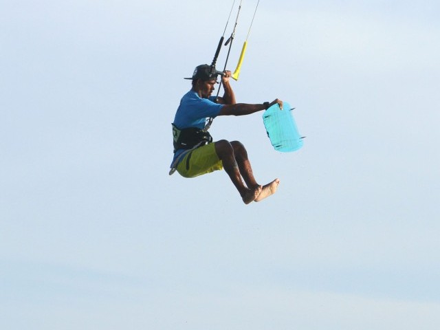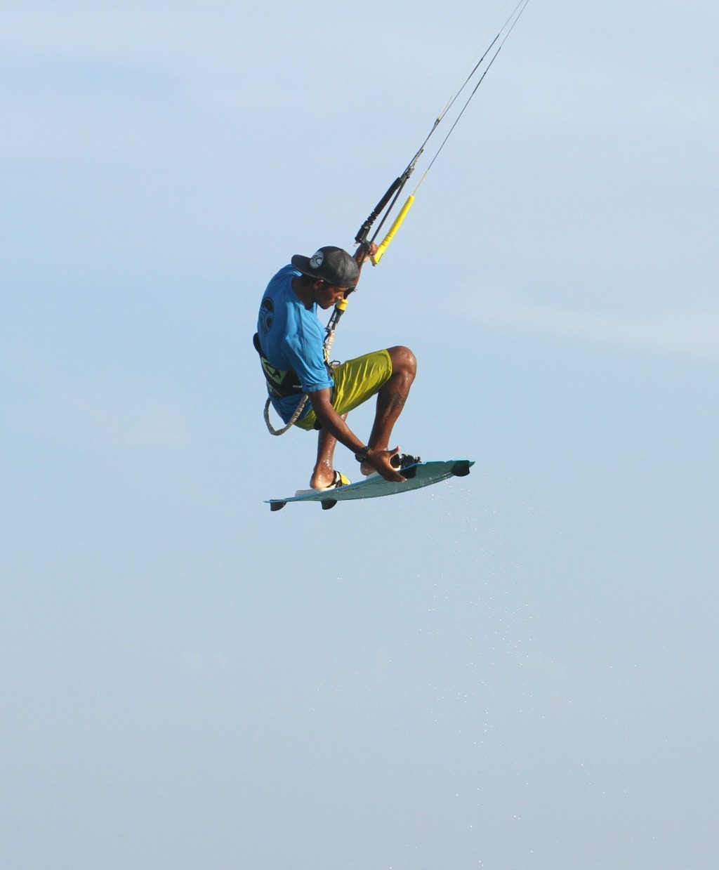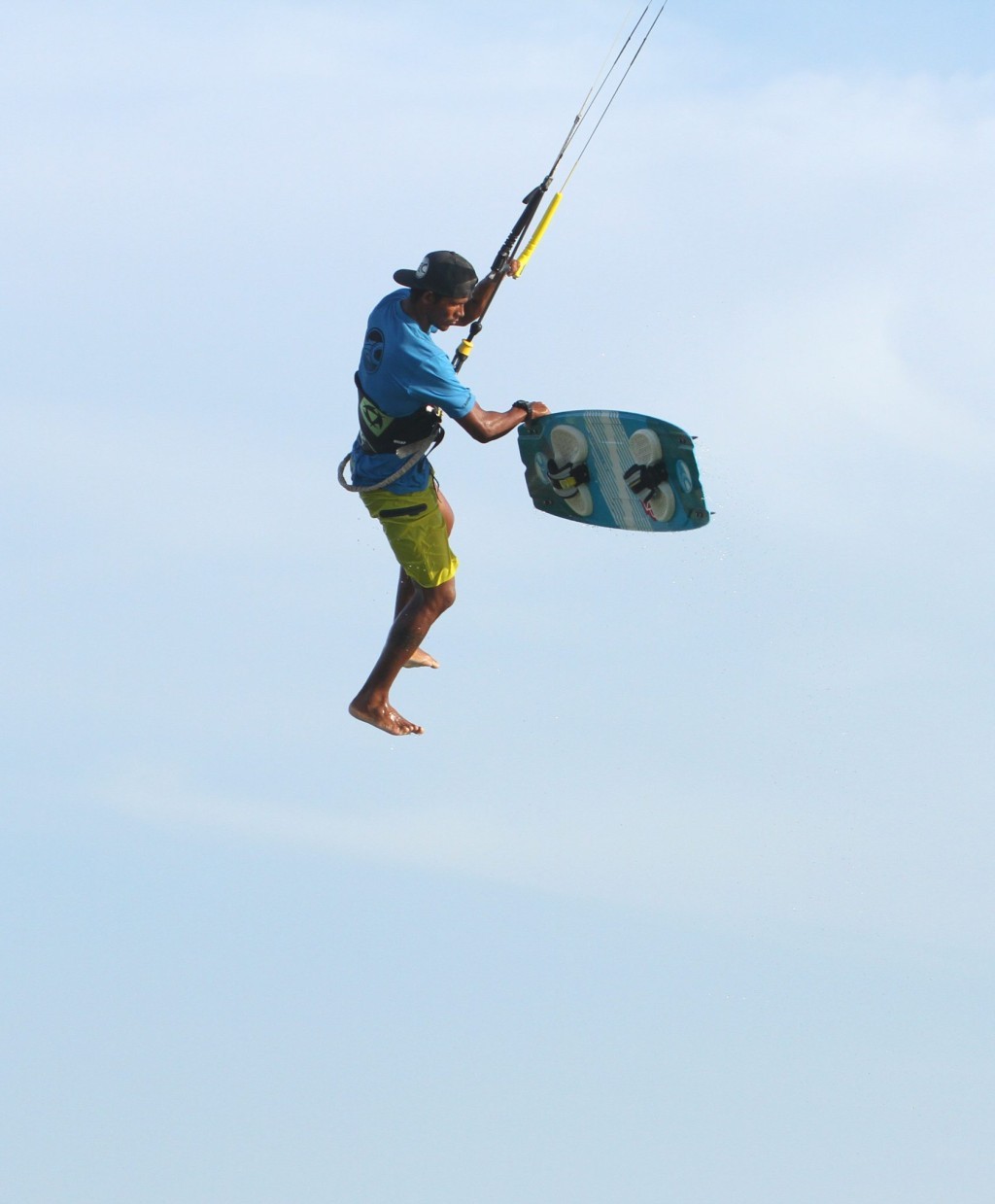 Once you’ve got the grab getting the board off shouldn’t be too much of an issue! Having your straps a tad looser than normal will help a lot and is almost essential for getting it back on. Because you’ve lent back and all your weight is in the harness, and your board is flat, you should be able to just lift the board up with your hand while pulling your feet back. However, concentrate on keeping the bar in or else the kite will stop supporting you, and you’ll already start your decent. All through this, you should ideally still be on the way up. Here Heliarde has his feet pulled back, bar is level, and the board is officially freed.