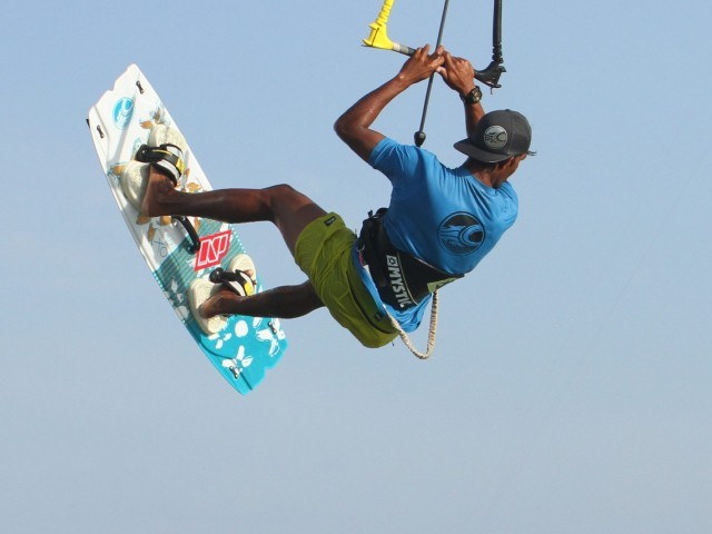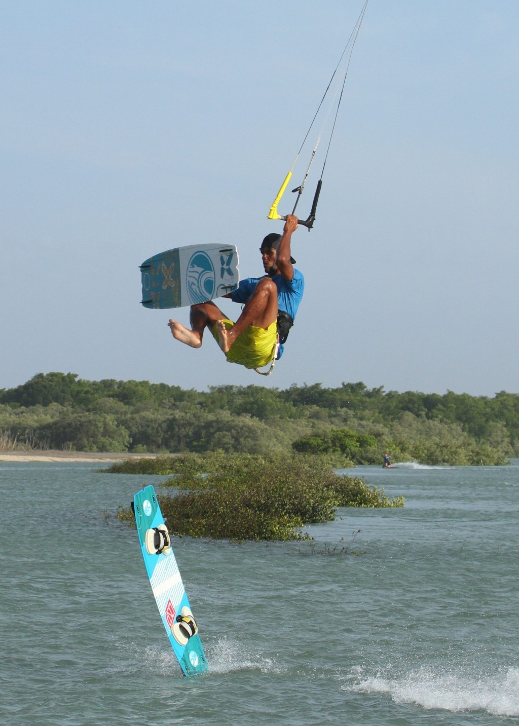 Here’s where the fun really starts. As the kite moves overhead and inches past 12 o’clock Heliarde initiates his lift off and back roll. At this stage, you’ve got three jobs. First is to get up off the water and stop the kite moving any further back in the window while starting your rotation. Second is to ditch your own board. Third is to keep the new board up and ready, from where you’ll be able to slip it on your expectant toes. To get up off the water keep edging and pull the bar in. With your hand centred this should also stop the kite from moving any further. In the pic, you can see that Heliarde’s elbow is high, which means that he’ll pull the bar down level. Ditching the board goes hand in hand with kicking off your back foot as you carve that little bit to get your rotation going. Footstraps are designed to let go, so if you’ve already wiggled your feet loose, as soon as you kick off the water with your back leg, roll over onto your feet and point your toes down. Gravity will take over from here as it does in the photo. And finally holding the board up and out is fairly self-explanatory, but it does require both mental and physical effort to keep it there.