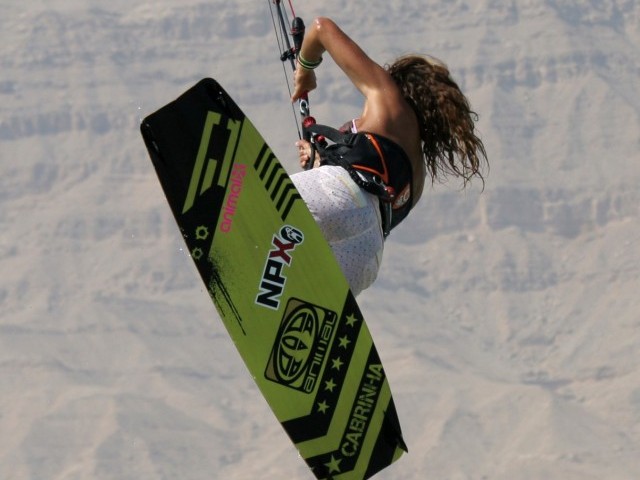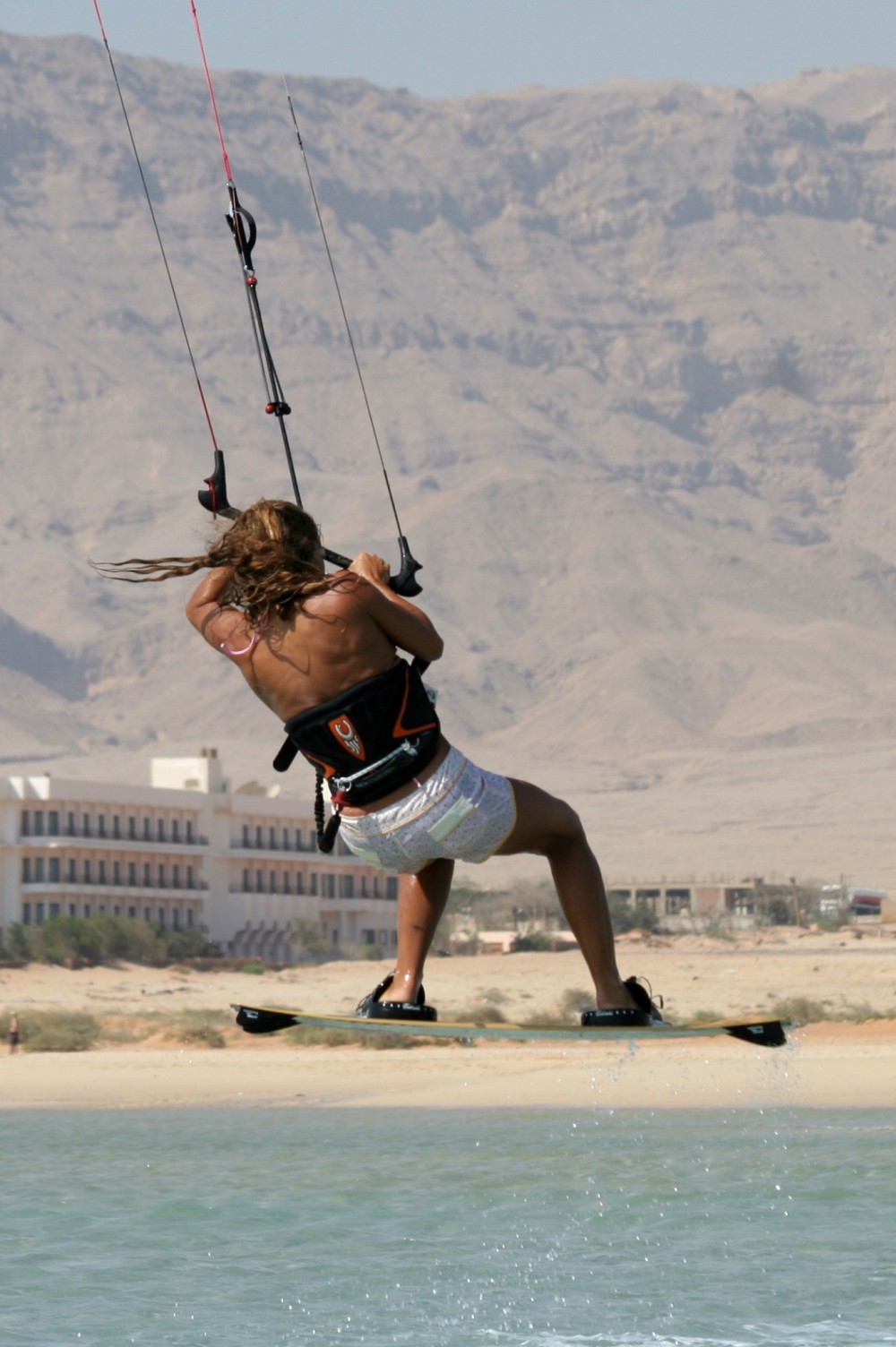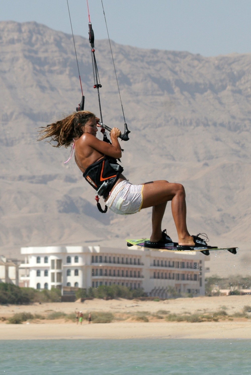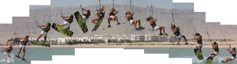 Karine just before take off. If you look at her hands and the bar you can see that she has sent the kite back, but not as aggressively as she would for a jump. There are two reasons for this. Firstly you don’t want to be jumping as high as possible. As this move is all about commitment, make it easier to commit. Once you’re three metres up you may well find the thought of looping your kite less appealing. Secondly you don’t want your kite to go too far behind you. The further back it goes, the lower it will loop, which in turn means a heavier landing. Apart from the gentler sending, much as a transition, Karine is still carving hard against the kite off her back foot and dropping her weight against the upward pull of the kite.