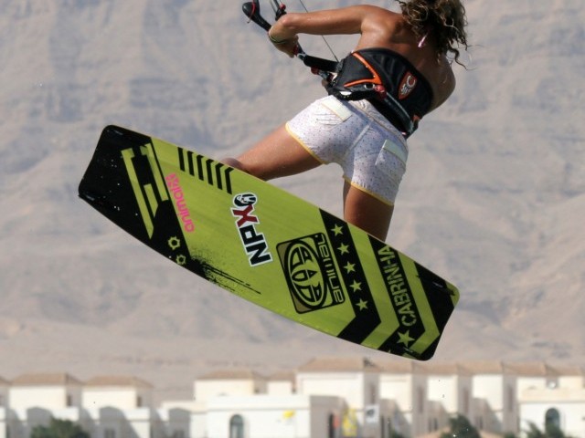 - Pic 10. This is the moment of most power as the kite starts to climb back up. Karine keeps her knees tucked up and pulls the bar with her hands to keep balance.