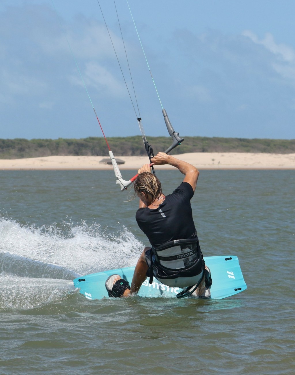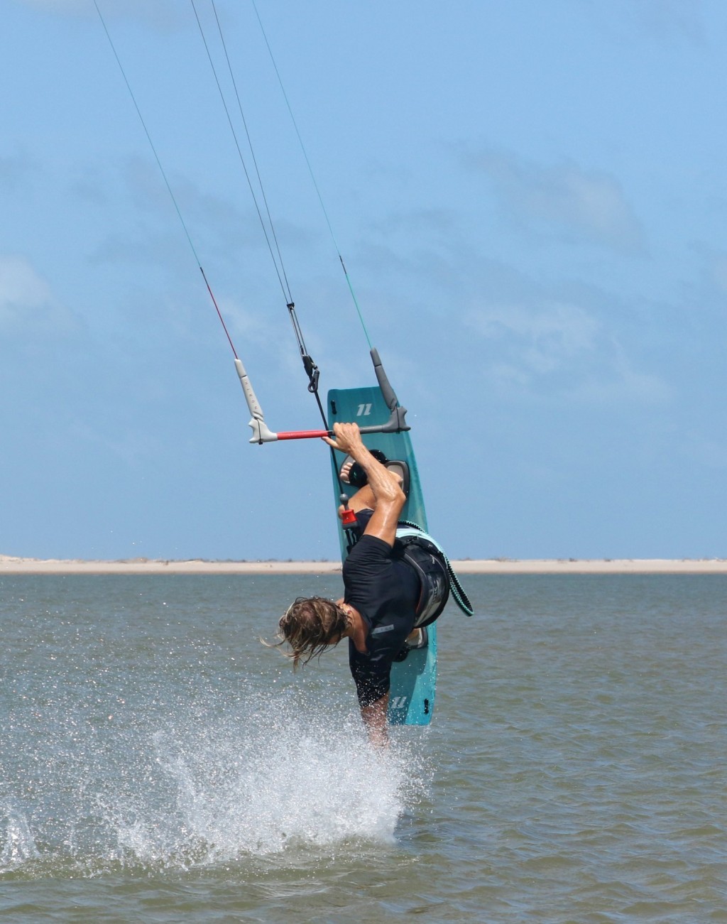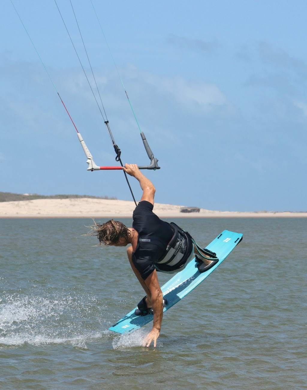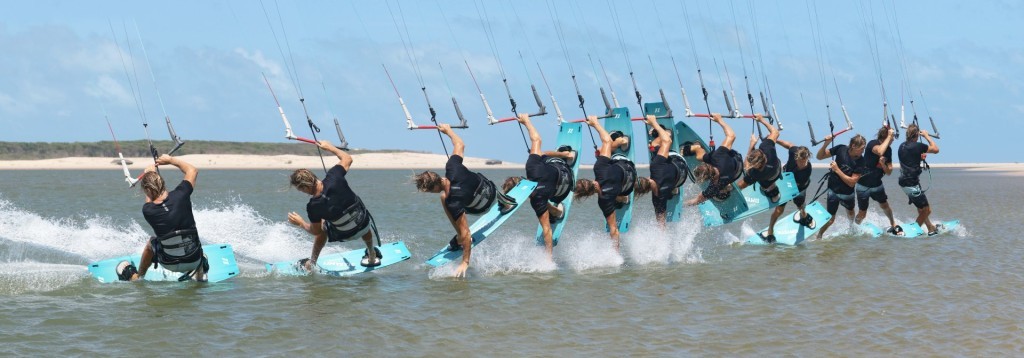 You won’t have as much drag time when learning this as you still need some lift to throw the blind. Hence the earlier you get the hand in and dragging, the longer it’ll look! That said there is a fair bit of multitasking going on here. As you feel that the kite is lifting you need to feather the bar out so that it doesn’t lift too much, whilst allowing you to get it behind 12 o’clock. You then need to stop the kite moving, by levelling the bar. You need to lean back and get your hand wet. And you need to pick your board up off the water. Looking at the photo you can see that Christian is leaning massively back towards the tail of the board, his shoulders are parallel with his centre line. This coupled with a controlled amount of lift allows him to dip his hand in super early. He’s got his bar level and he’s quite literally lifting his knees up into his chest to lift the board off the water. Drag already in motion.
