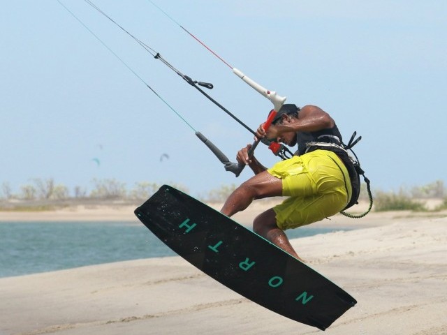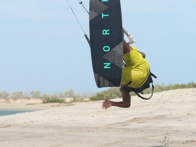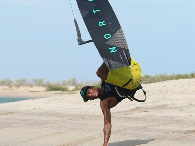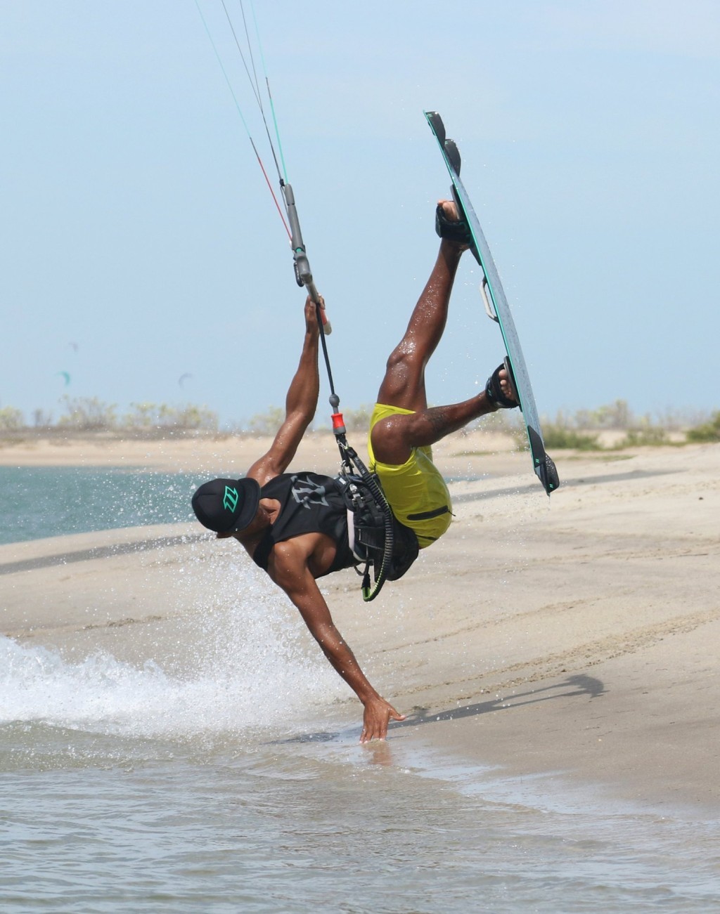 Now it’s a matter of patience and control. You should hardly be moving, and if you are you can slow yourself by easing the bar in further. With the kite just behind you, it’ll act as a brake. Extend your free arm down to make contact with the beach. Once you touch the sand you have your feeler out, so you can either pull in on the bar if you’re too low, or feather it out if your barely reaching it. If you’re planning on stylig it out this is the time to start boning the board. Keep your front knee in whilst extending your back leg, foot up to the sky. Looking at the pic, Heliarde still has the bar level, on the sweet spot, he’s boning the board up and is rotating around his hand.