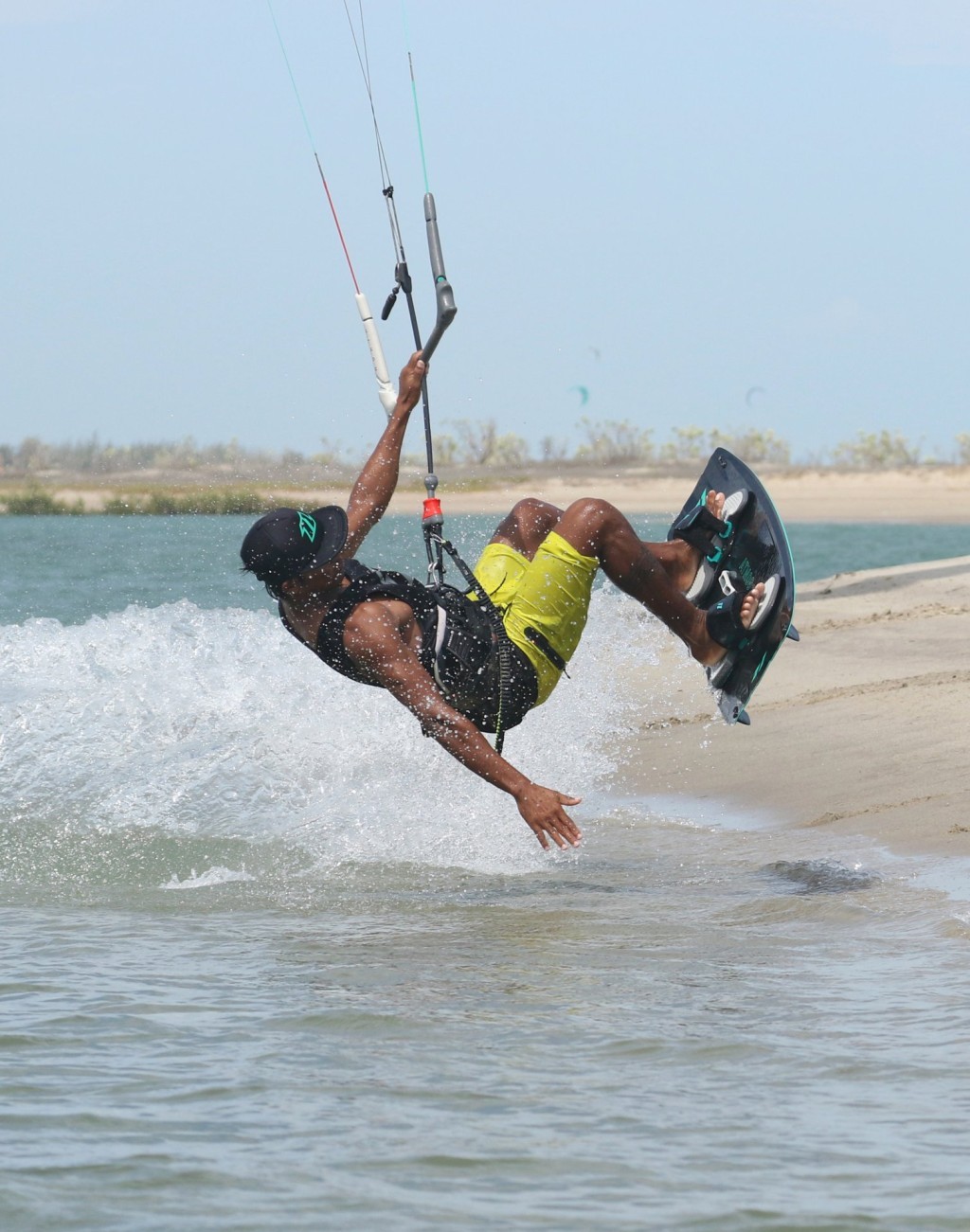 With the bar out you can carve up into the wind to slow down as you near the beach. This needs to be done with some aggression, so do resist with your legs. This not only slows you down but the turning up action will be the initiation into your back roll. As soon as you slow enough, you need to stop the kite moving, as it should only sneak up to 12 o’clock, or a fraction past. You also need to rock your weight back in preparation for lifting the board. Looking at Heliarde, he’s leaning back, carving up and he’s pulling the bar in to get control of the kite.