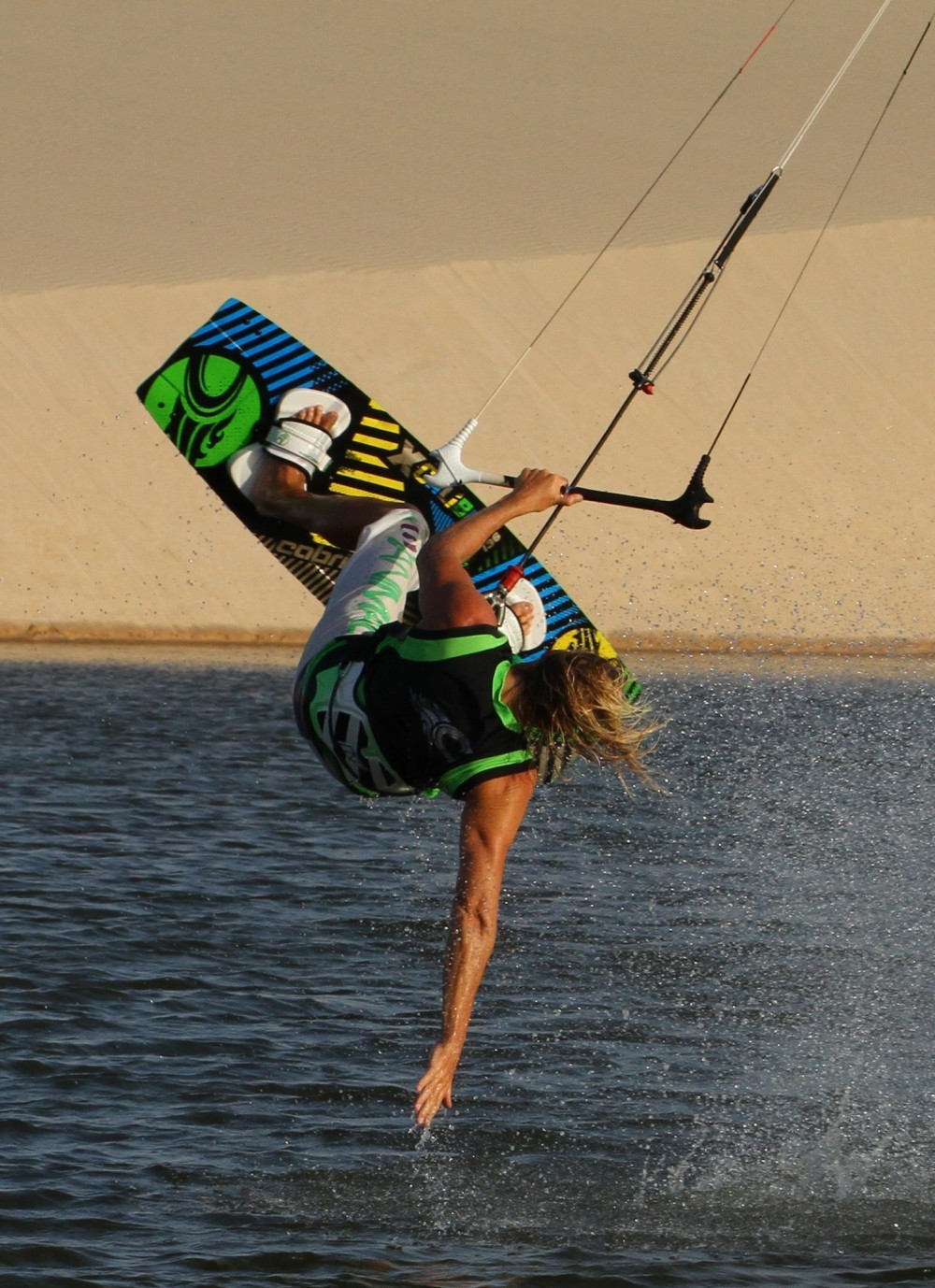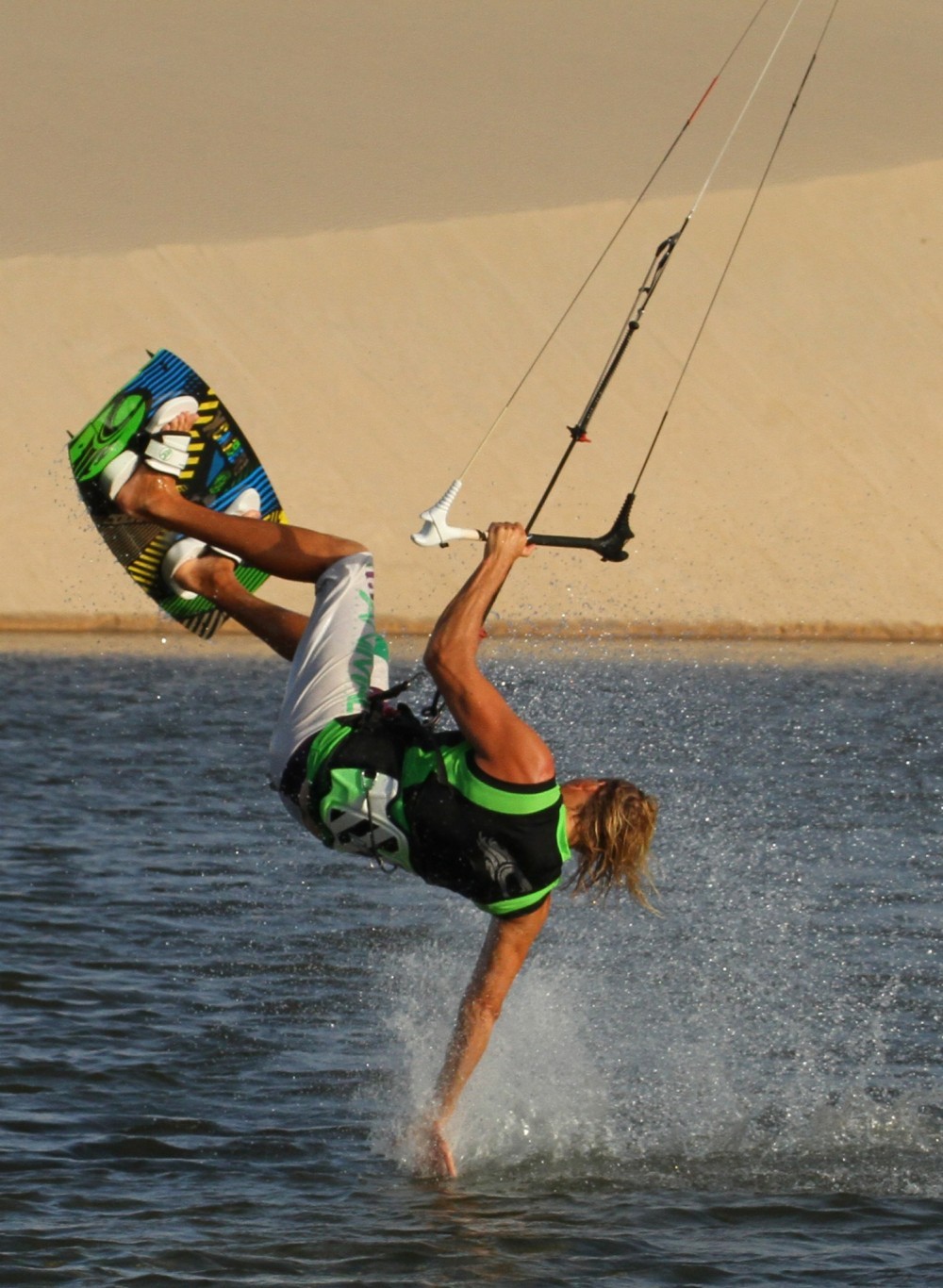 Christian has his arm straight, locked out underneath him, in a very bad impersonation of a hydrofoil. If he had planted his hand further upwind, he wouldn’t be able to resist and his hand would just drag along the surface behind him. As a result of turning into the wind and leaning back before lifting his edge out of the water Christian initiated a slow back loop. To make the move look more stylish you want to get some inversion involved. To do this, Christian rolls back in his harness and lifts his feet and knees. To take it even further he could throw is head back.