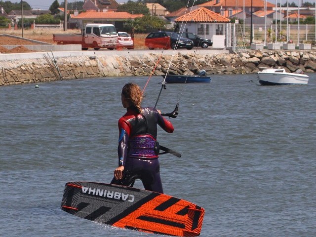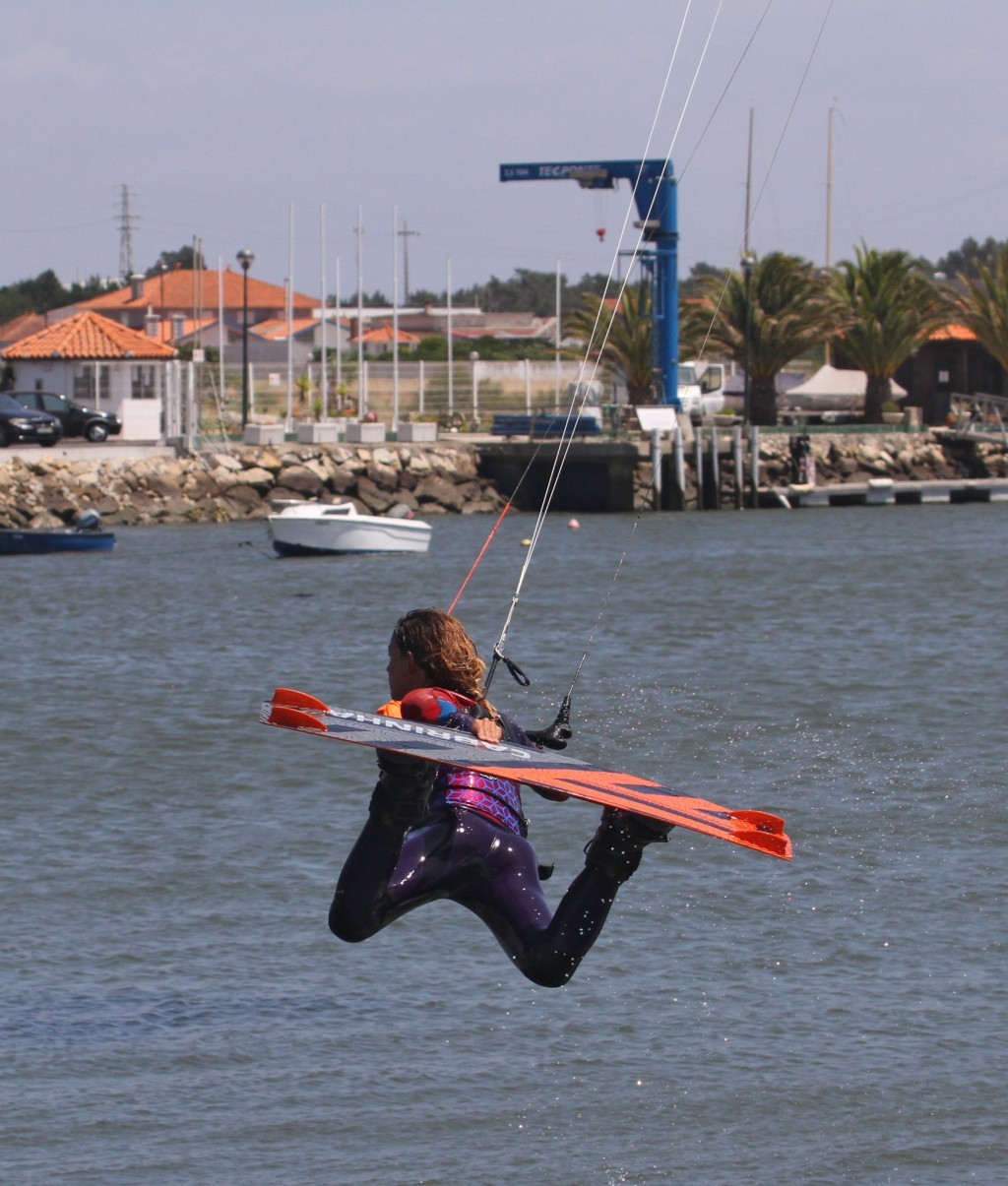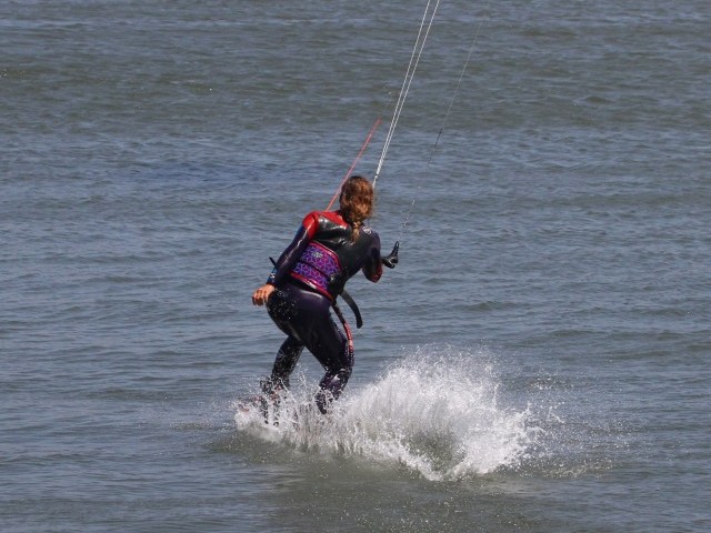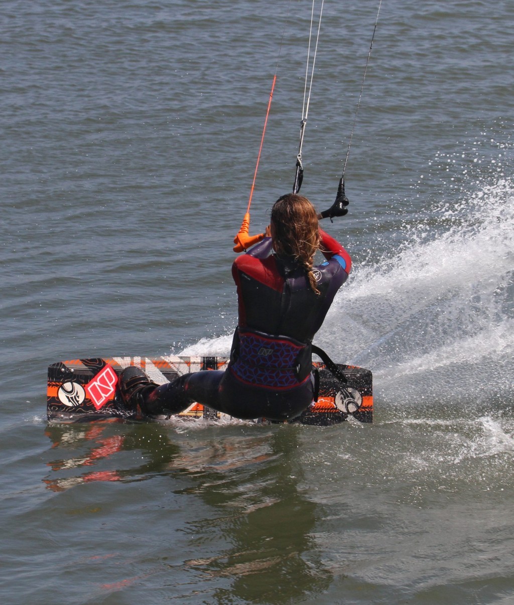 If all goes to plan this is what will be happening. You’ll be in a back scratching position with the board up flat behind you, knees bent, so that you can easily reach the heelside edge and claim a firm grab on your board. You can see that Karine has her bar pulled in on the sweet spot, if not she’d just drop and it’s not like you’ll have hours up there anyway. She’s looking forwards to where she’s going, and the kite is still pulling, it hasn’t sneaked up. Nice.
