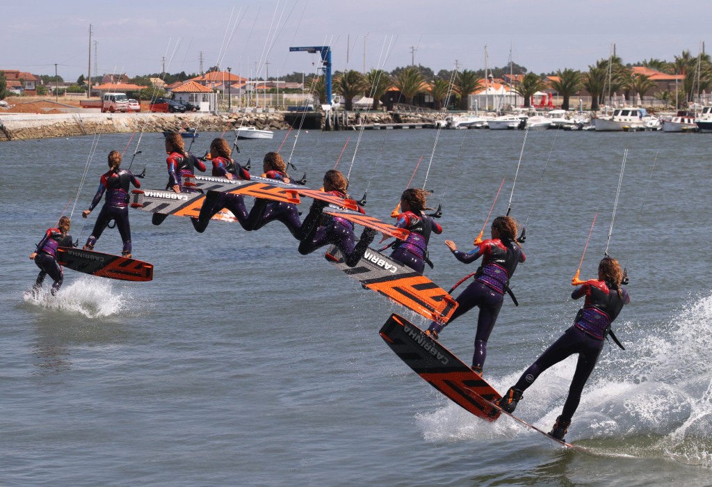 Yes, that is a pair of offs. We’re talking from the water and from the bar. Let’s start with the water. Our take off will set in motion what happens next, or more specifically what type of move we’ll go into. As previously mentioned, we want a toned down raley; not a flicked outstretched powered number. So, as you pop you will not swing your legs around and follow through from your carve. This action will give you flick. What you’re aiming for is more of an old-school kick in the head type raley, which means that the board will be horizontal, parallel – ish to the water rather than vertical nose high. Your knees will bend so that the board scorpions up behind you. This has the rather brilliant effect of placing the board within reach of the forthcoming grab. The next off is the front hand. It stays firmly on the bar while you pop and only releases once you’re airborne. Reasons being that you can control the power with two hands, keeping the bar on the sweet spot, you can also keep the kite still so that it doesn’t drift up and you can keep your shoulders facing forwards. Whereas with your front hand off early you’ll twist into a flick. Looking at Karine, you can see how the board is coming up behind her rather than flicking around. She’s now released her front hand and is reaching back, and her knees are bending, so that the board comes closer.