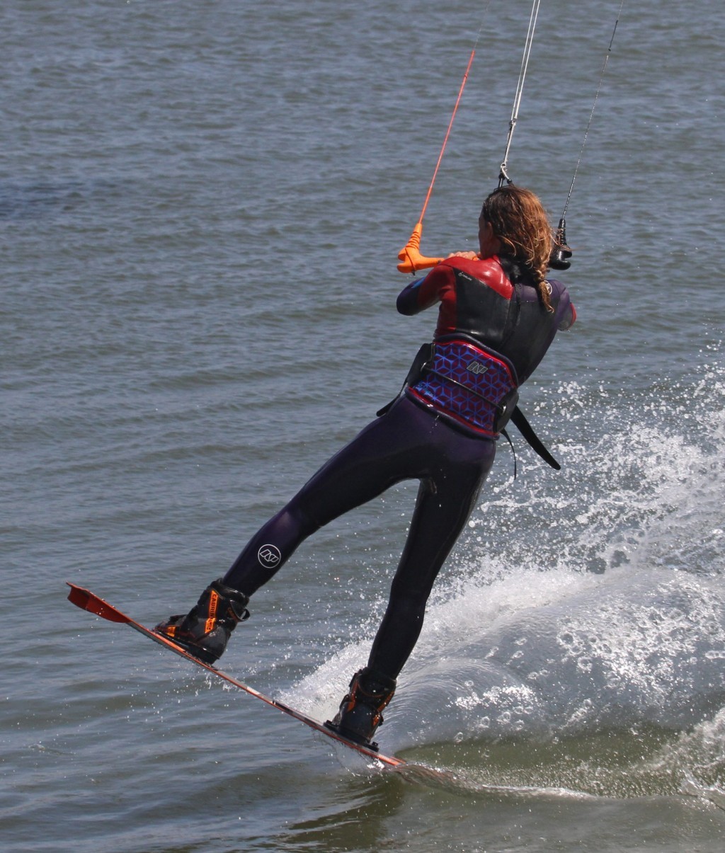 Hopefully, this bit should be pre-programmed but just in case we’ll have a quick recap. Popping is about extending, aggressively exploding against your edge – stamping down against your back foot, kicking yourself upwind of your board. It’s the kite that then pulls you forward. The timing of your kick is important as it’ll decide what happens next. Assuming that you went off the wind, it enables you to carve back up without stopping, however, if you wait too long the kite will start to pull you up and over the board, which then means you can’t stamp against it. Because you’re hooked in you, do have the ability to sheet out slightly if the kite pulls you before you’ve popped. However, there is also the danger of trying to power yourself off the water by pulling the bar in. This is a monster no no. It must all come from your back leg – don’t wait for something to happen, make it happen. You can see that both Karine’s legs are extended, her front was already as her weight was back, and now her back leg is also extended as she stamps against the board. It’s also important to note that she’s looking forwards, the kite hasn’t moved, and she still has both hands on the bar.