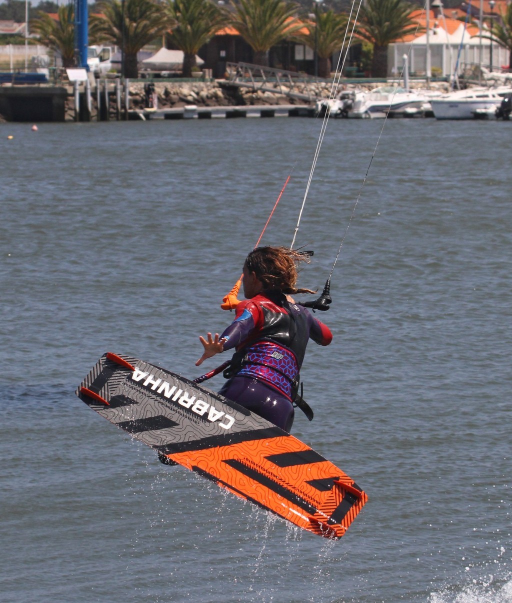 As with all pop tricks, your landing will be easier if your approach was correct. That bearing away downwind before carving up to pop dropped the kite back in the window and meant that you had pull through the move and downwind slightly, making the downwind landing a cert. Added to this keeping the bar on the sweet spot because you’re hooked in, and you’ve got it made. You can see here that before landing this one Karine didn’t have time to get her front hand back on the bar, but it didn’t matter as the kite has not moved up and the bar is in so she’s pulled all the way. As long as she points the board downwind towards the kite and lands flat, she’ll hammer on.