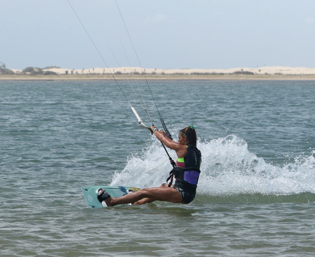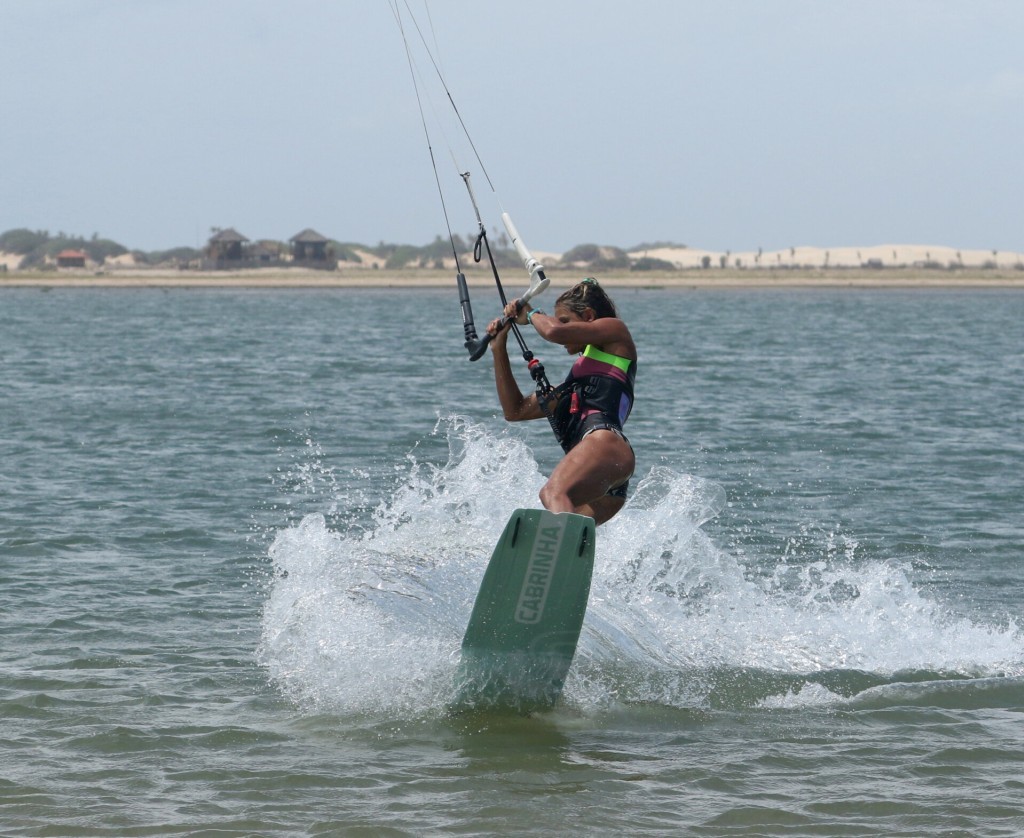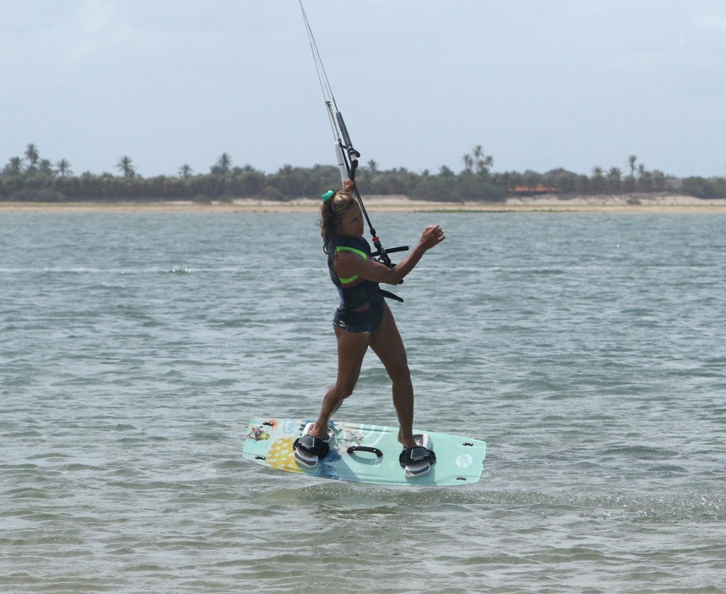 As soon as you bear away, it’s time to carve back onto your edge so you can pop. As this is a hybrid, you will move the kite up. You won’t be carving for long; steer the kite up as soon as you drop your weight to carve. Here, Karine has steered the kite up; she’s dropped her bum low to the water and is carving hard upwind. Note how Karine feathers the bar out to keep it on the sweet spot. Pull it in, and the kite will pull you off your edge, ruining your chances of a decent pop.