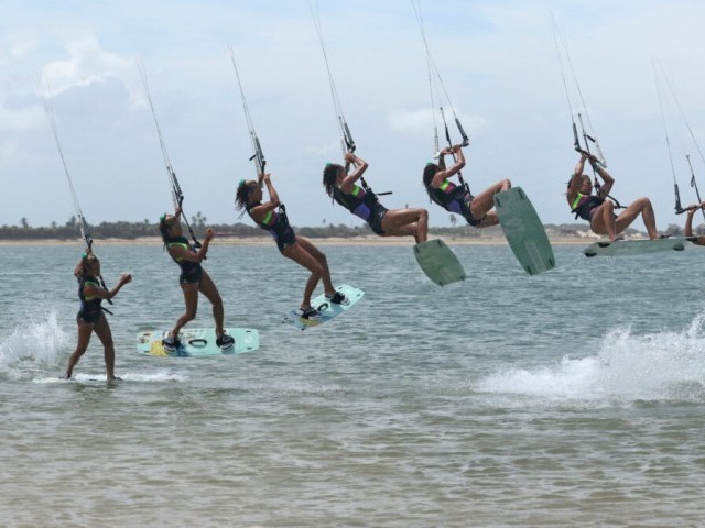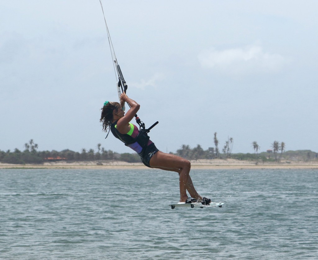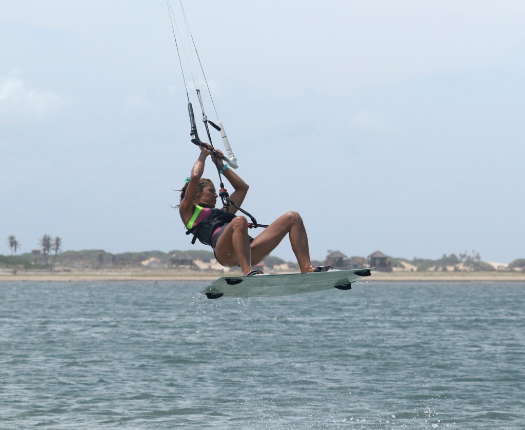 You will pop into this just as you would for a popped back roll. You choose when to go by stamping. Don’t wait for the kite to lift you! You want a slow rotation to stop it and throw the blind. Fortunately, this goes well with a good pop, so direct all your effort towards exploding off the water and trust your carve to initiate the rotation. If you look at Karine, you can see that she hasn’t turned her head; it’s perpendicular to her shoulders as she blasts off. This helps keep the rotation slow. She’s fully extended her back leg to get maximum pop, and her bar stays out on the sweet spot so that she gets maximum up!