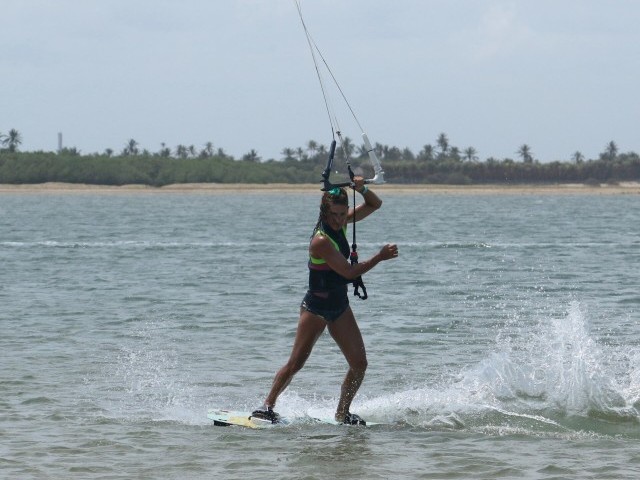 When the tension increases, you can push the bar upwind and across the front of you. You’ll end up toeside and can either stay this way or slide around to your heels. You might already have this in your box of tricks, but remember that if the kite is low, it’s much more difficult to Ole. Karine’s lines are slack, so she turns her head and shoulders, pushing the bar away and around until she ends up toeside.