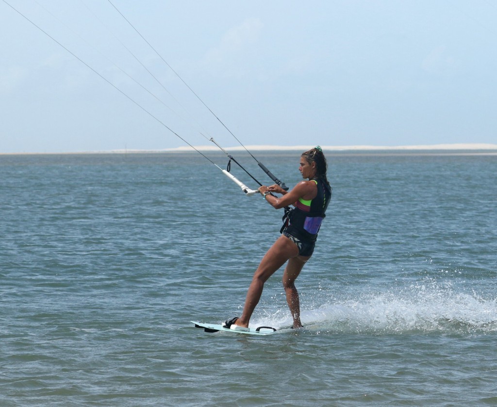 This part will depend on how you land in relation to the wind. The more downwind you land, the easier it will be as you’ll be chasing the kite and have little tension. However, if you land more across the wind, you’ll need to exaggerate this. To get tension off the lines, you must flatten the board. Keep your head up, turn to the new direction, bend your knees, and rock your weight onto your heels whilst pushing the bar as far out as possible. Karine drops her weight, turns her head and pushes the bar away. This will get you off your edge (if you’re on it) and turn the board towards the kite, freeing you of line tension, which means it’ll be easier to…