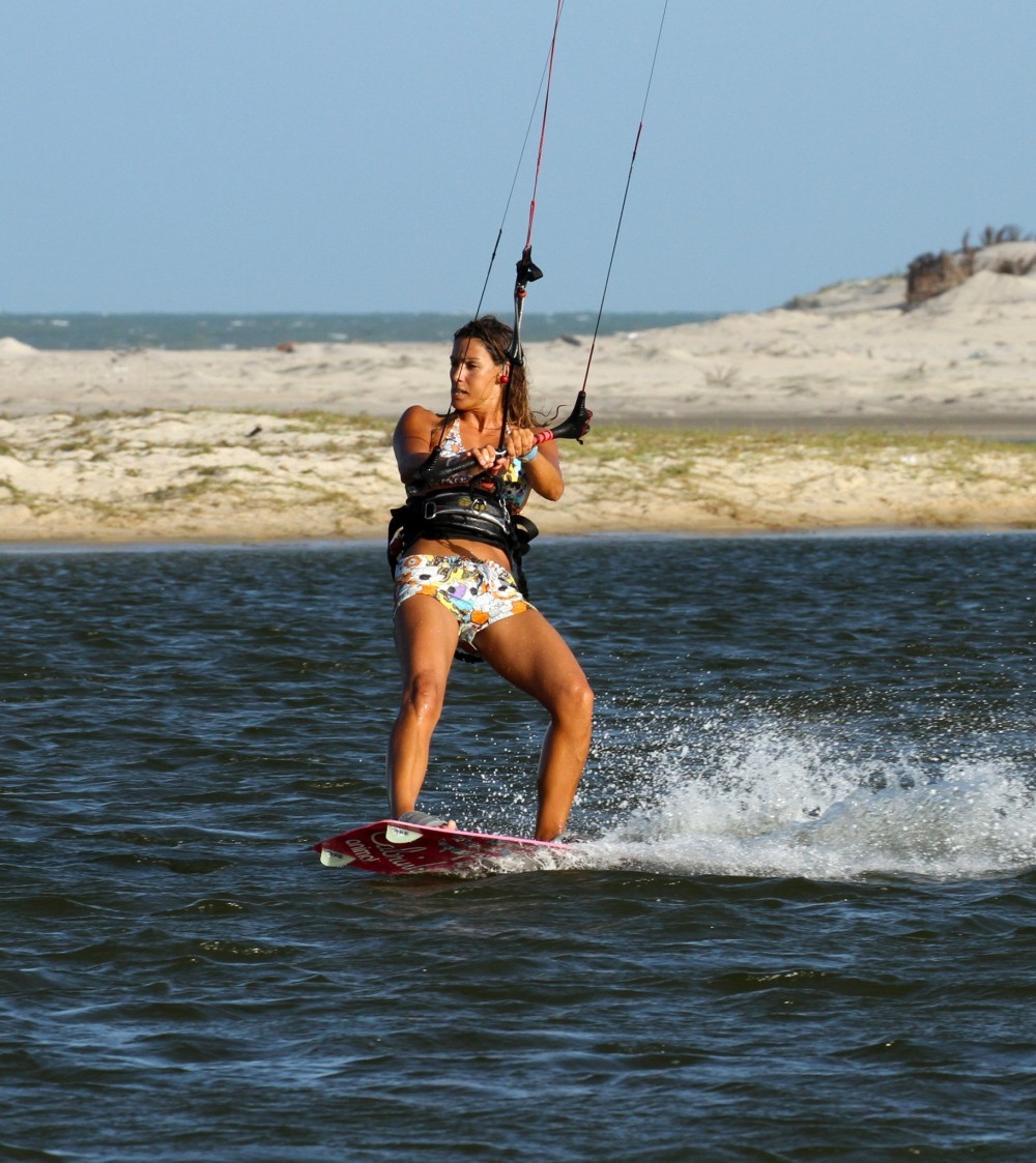 - Pic 1. With good speed and her kite a 1 o’clock Karine bears off the wind by bending her back leg and pushing her front foot away, keeping her hips up and positioned over the tail of the board and shoulders back. Her hands are centred on the bar.