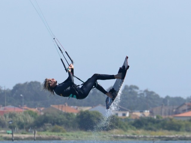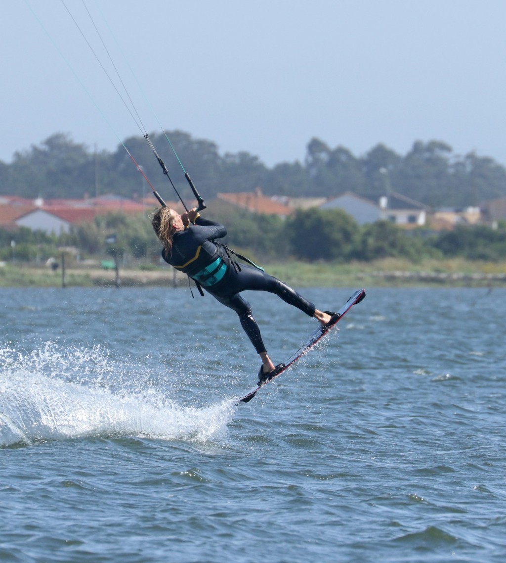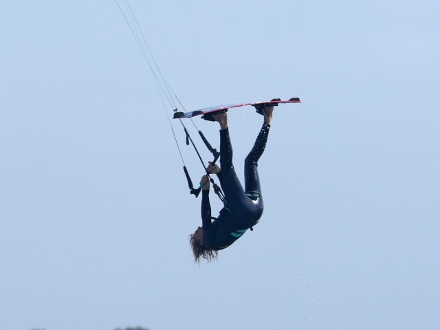 Once you feel the fulcrum is in full swing, that the kite is still floating you, and therefore in the right place, somewhere near 12, you can go the full nine yards and empty the change from your pockets. This will most likely be about halfway around when you would normally be looking upwind. To get the maximum inversion, kick your legs up towards your kite, presenting the bottom of your board to the spirit in the sky. If you do this aggressively you might well feel the board bump your lines. Throw your head back to get your upper body pointing down. Looking at Christian, he’s kicked the board up, his legs are extending, whilst his head is tilting back further. To get full marks, he could have bent his neck back and looked at the water which would have straightened everything into a perfect inversion. 🙂