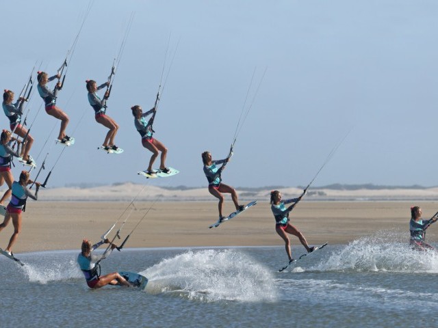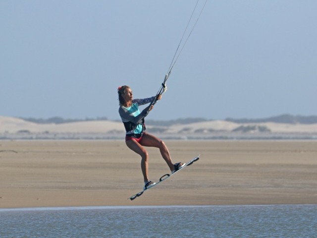 If you’ve been psyching yourself up on death metal and hefty shots of expresso on the way to the beach, it’s worth remembering that you’re not going all out, guns blazing, gung ho. Instead, you’ll be patient and late. As you rise into your jump, keep the bar level, make sure you’re balanced and look where you usually look, slightly forward in the direction you’re travelling. Bring your knees up for balance, and if your kite is behind 12, you can give it a little tweak forward so it’s sitting bang at midday. Karine is lifting; her kite is right above her, she’s got her bar in on the sweet spot, tension on the lines, she’s looking forwards, bringing her knees up and most importantly, waiting. You want to pass the apex of your jump and know that you’re descending.