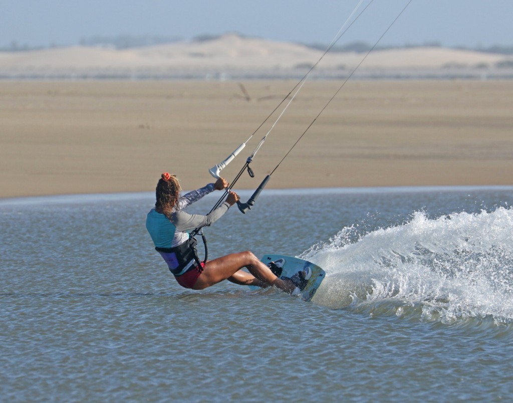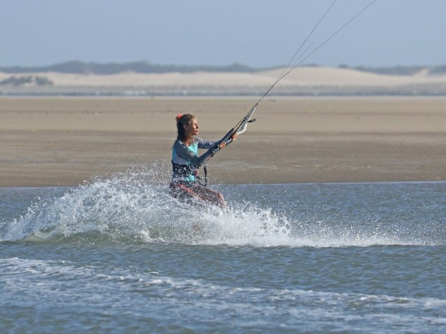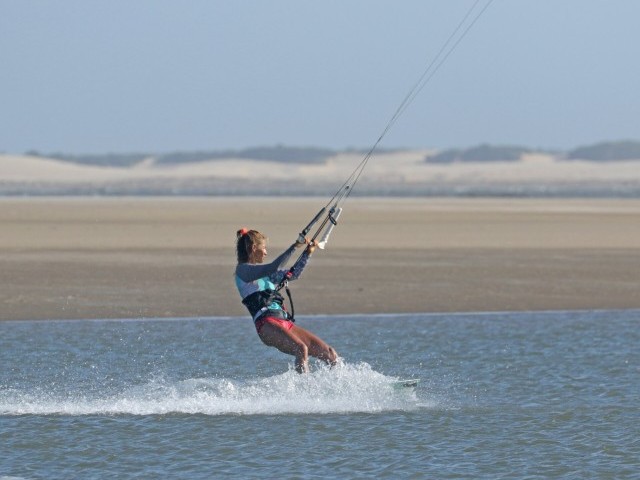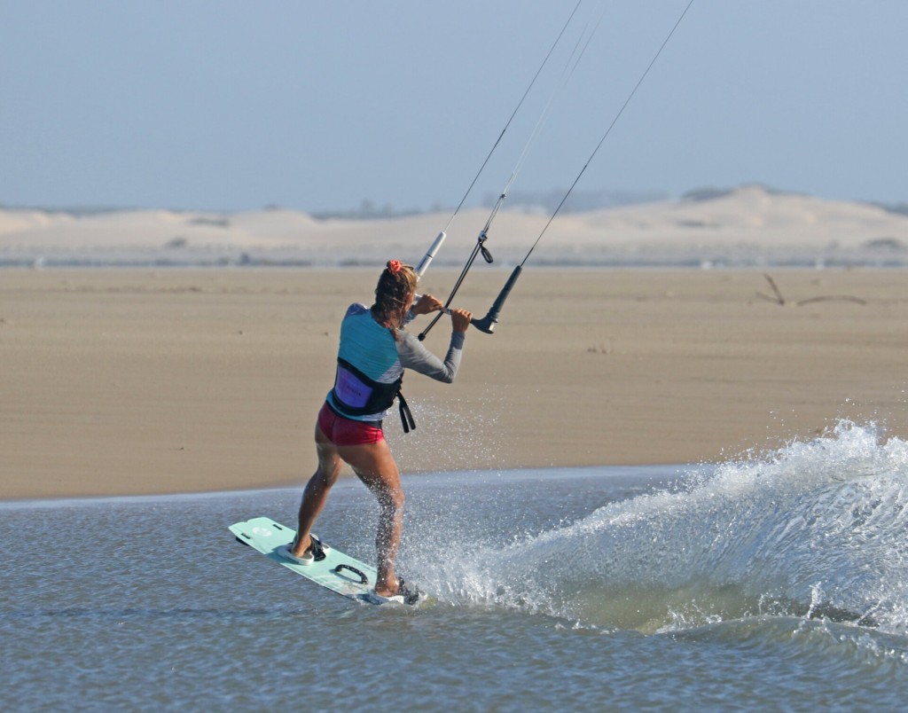 Now, things should start to feel familiar, with the kite pulling and yourself following the pull. The great thing is that with the kite acting as your guide, you can watch it, follow it, and be confident that you’re travelling in the right direction. You need to prepare for landing, twist your hips and point the board towards the kite, aiming to land, pointing just back from downwind. Keep the bar locked into push-pull mode so that the kite continues to loop, and don’t allow the power to pull the bar up and away from the sweet spot as the kite loops. Karine’s eyes are on her kite; the bar is locked into the full Monty, and she’s turning her hips and board to follow the kite in preparation for landing.