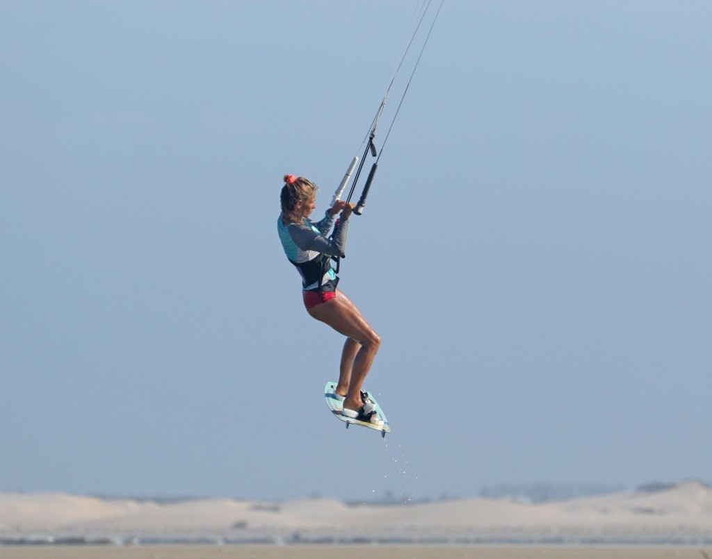 This bit may take a bit of practice. You'll need to tame it down if you’re used to sending your kite hard for bigger airs and letting it go quite far back in the window. It’s all to do with starting your loop at 12 o’clock. If the kite goes too far back, you’ll have a lot of work to get it forward to 12. The key here is to level your bar before kicking off so your kite stops moving back just after it hits 12. This means you can’t drift it up slowly on the send because you won’t get the lift for your jump if you do. As Karine kicks off her bar, she is already levelled, so her kite stops. Also, it is worth noting that the kick against her edge comes before she pulls in on the bar to ensure that she gets that up, takes off and doesn’t swing downwind. This way, the kite will remain above her, so she’ll have tension in the lines when needed.