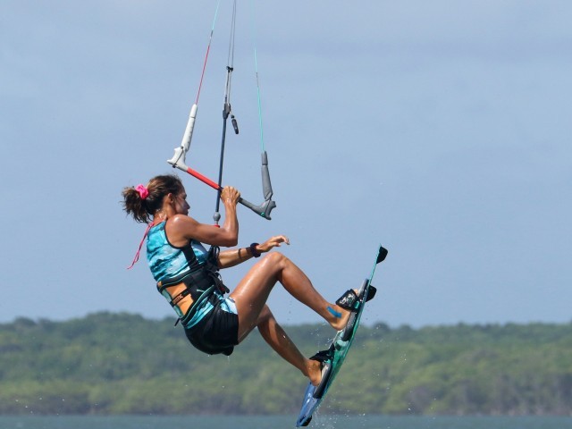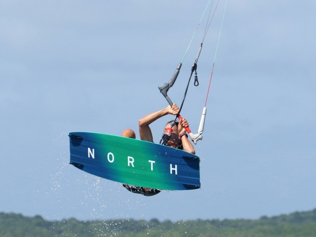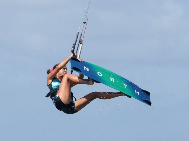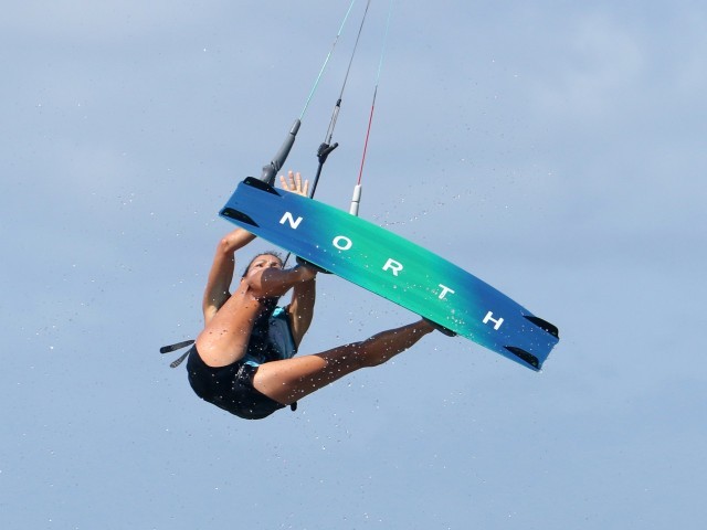 Once you’re in the air you have two jobs. Get the kite under control so that it’s where you want it and get the board up and close so that the grab is possible. If you have a look at the pic, the first glaring fact is that Karine’s bar is not level. She’s actually steering the kite forwards to make sure it doesn’t go back. This may seem counter intuitive in a transition, but with the kite redirecting forwards she’ll also get some drift in that direction, which will give her both more balance and more time and stop the kite drifting back as it normaly would. You need to get this done whilst you’ve still got two hands on the bar. Next off is getting the board into a grabable place. So bring your knees up just like Karine. Last take away from this image is that Karine is looking at where she’ll grab, the present tail but the nose to be. This will not only make the grab simpler, but will also slow your rotation down as you’ll be looking the wrong way.