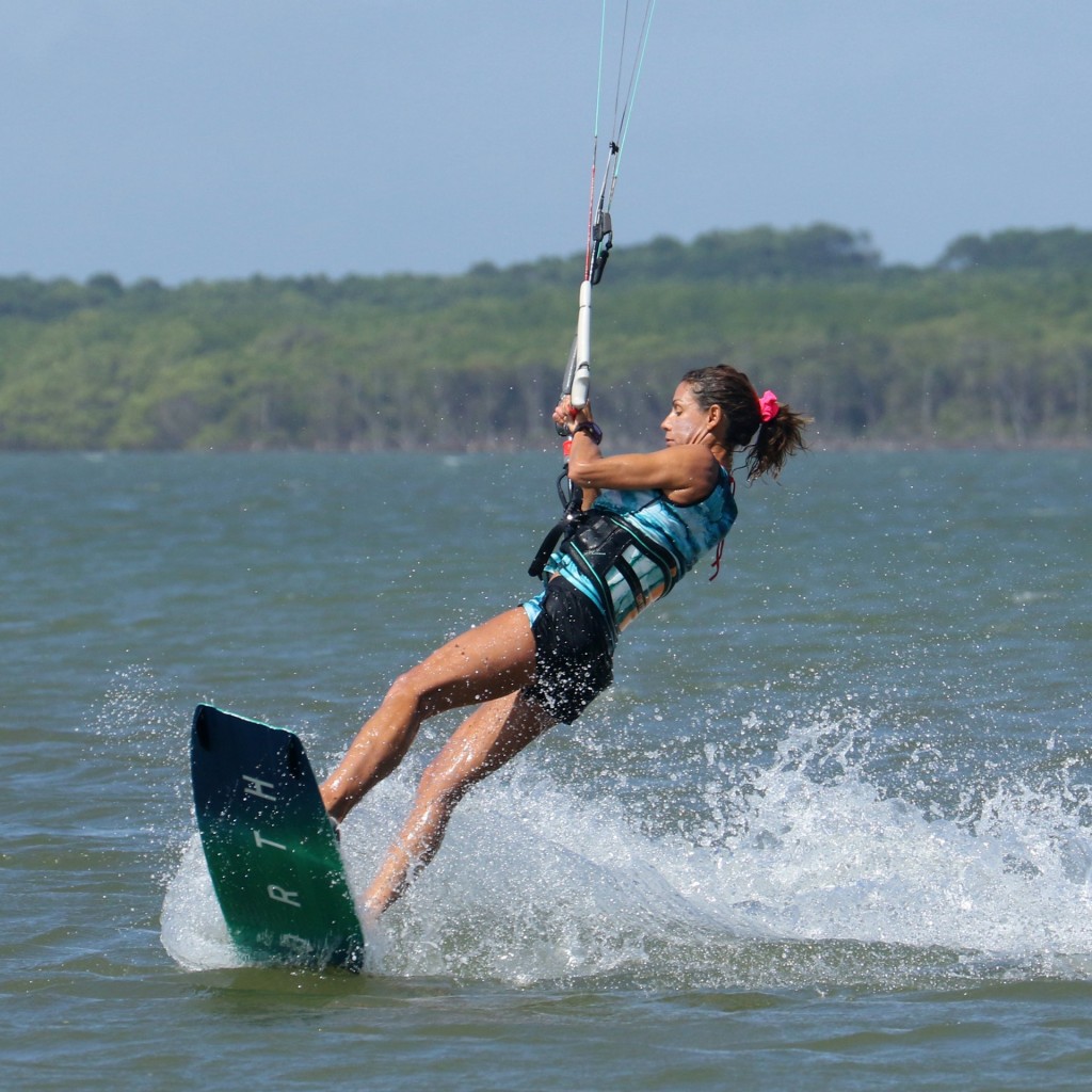 With your legs sorted, the kite in place and the bar level you can now grab the nose and tweak it for all your worth. Make a concerted effort not to steer the kite as you keep the bar in on the sweet spot by keeping the bar level. Now Karine has the grab she can look where she hopes to land and hold her position until she comes around and starts to drop.