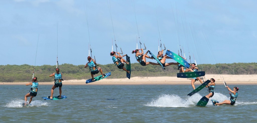 This doesn’t need to be a high move, but you do need time to both rotate and sneak in a new nose grab, so a few extra nano seconds and a slower rotation won’t go amiss. To give yourself time and balance in the air it helps to be moving, so come in on an edge with comfy speed. If you’re feeling sluggish you can even relax your edge to accelerate coming into the move. With the coast clear it’s a hefty short sharp send to move the kite quickly from either 1 o’clock or 11 o’clock. As the kite starts to move you’ll need to check your speed by carving up slightly, which will also put pressure onto your edge and give you something to kick against when you take off. You can see that Karine has some speed, she’s given the bar a positive push/pull on the sweet spot and she’s carving the board up slightly to increase both tension in the lines and pressure on the edge.