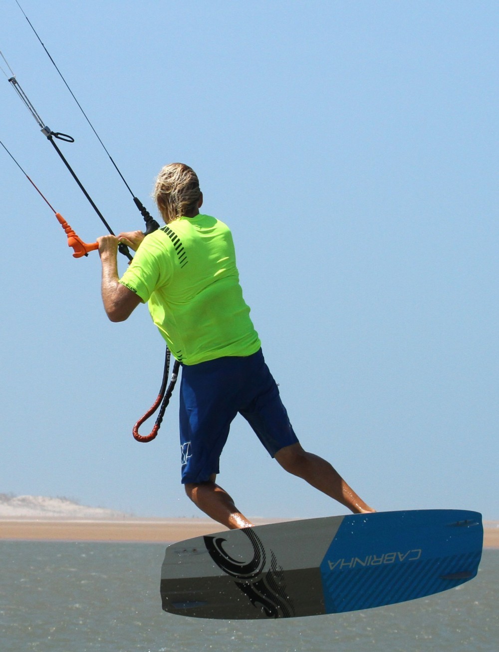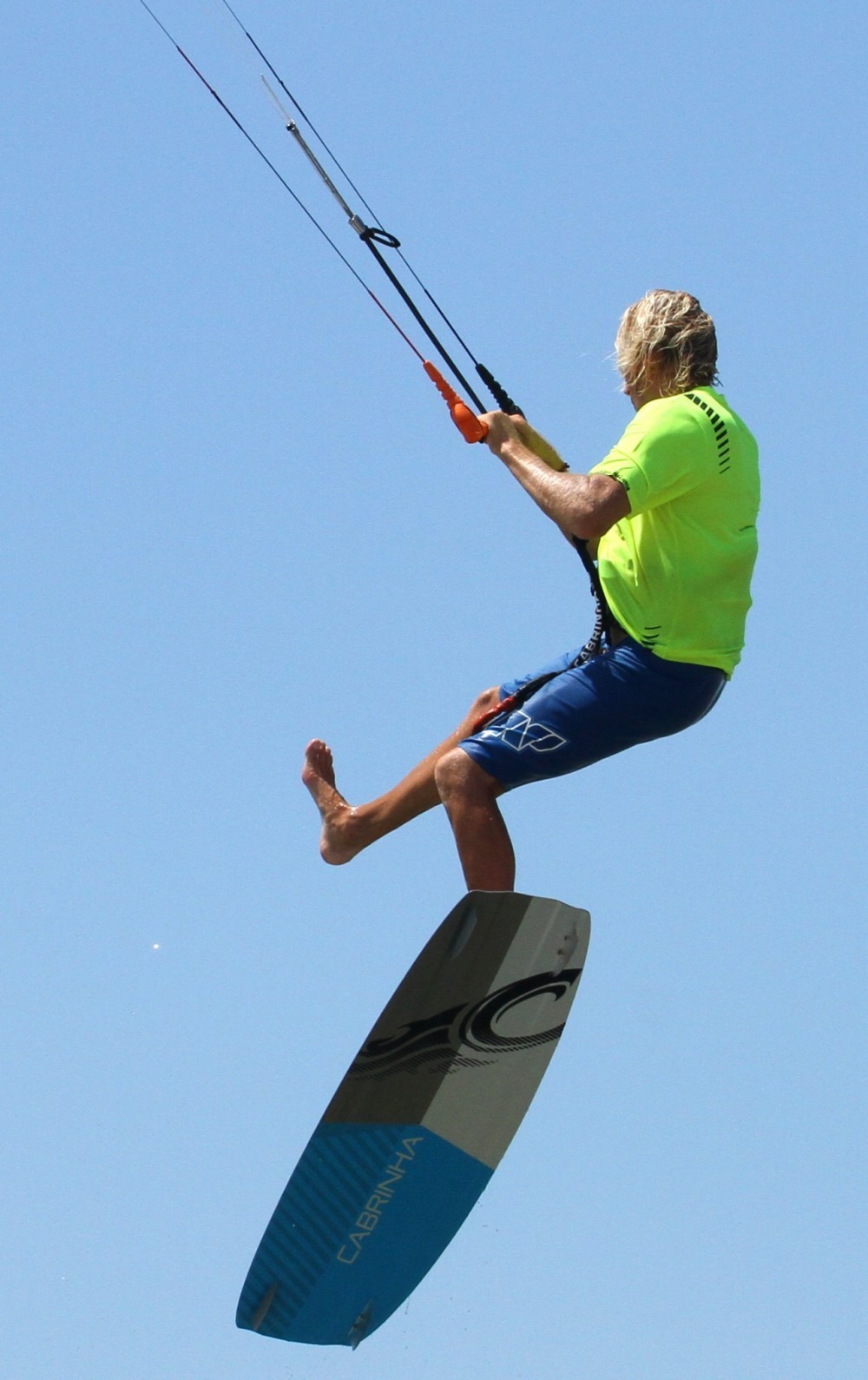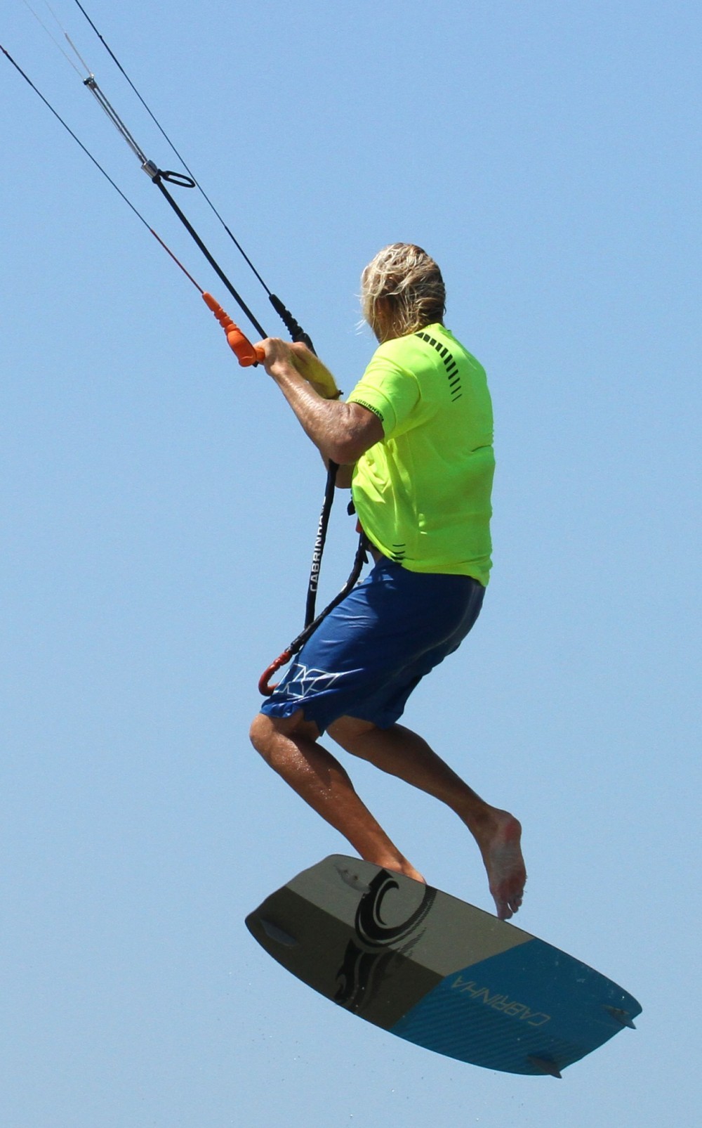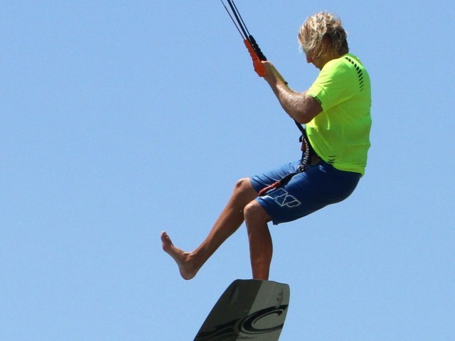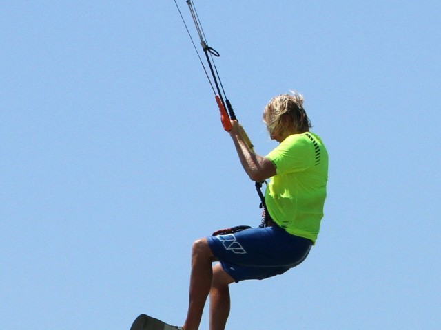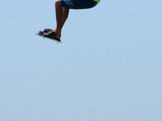 As soon as you’re off the water and controlling the kite you should be working on sliding your front foot out. The earlier you get it out, the earlier you can put it back in and the more chance you’ll have of landing. This where your front foot being loose in the strap comes into play. With the board in a toes-down position you can use the boards weight and gravity to your advantage. You can see in the picture that Christian’s back foot is still firmly wedged in so as long as he keeps the board toes down his front foot will be dangerously close to slipping out of the strap. Therefore, all that is necessary is for him to bend his front leg, lifting his heel in the direction of his buttocks, et voila, the foot is free whilst both hands remain firmly on the bar.