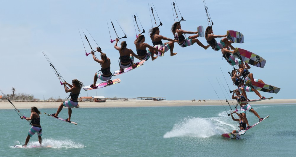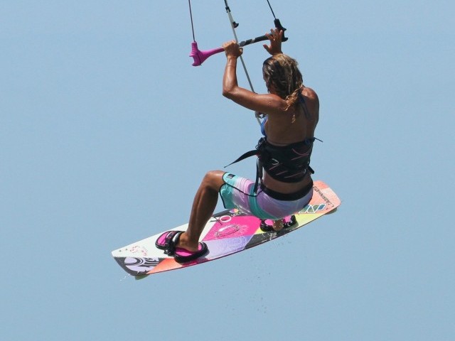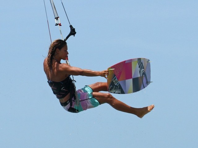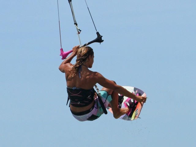 This part will really decide how much time you’ll have and how slowly you’ll rotate. Having sent the kite hard against a good edge the lift from the kite should come early, once the kite is around 12 o’clock. As soon as Karine feels the pull she stamps up off her back leg, extending her entire body up in a popping motion and simultaneously pulls the bar in, both for extra lift and to stop the kite moving any further back in the window. By popping up Karine is carving up into her rotation but she isn’t turning further into wind and therefore she won’t spin uncontrollably. All the while Karine keeps her head looking forward through the bar, again making sure that she doesn’t rotate quickly so that the grab and one foot will be simpler.