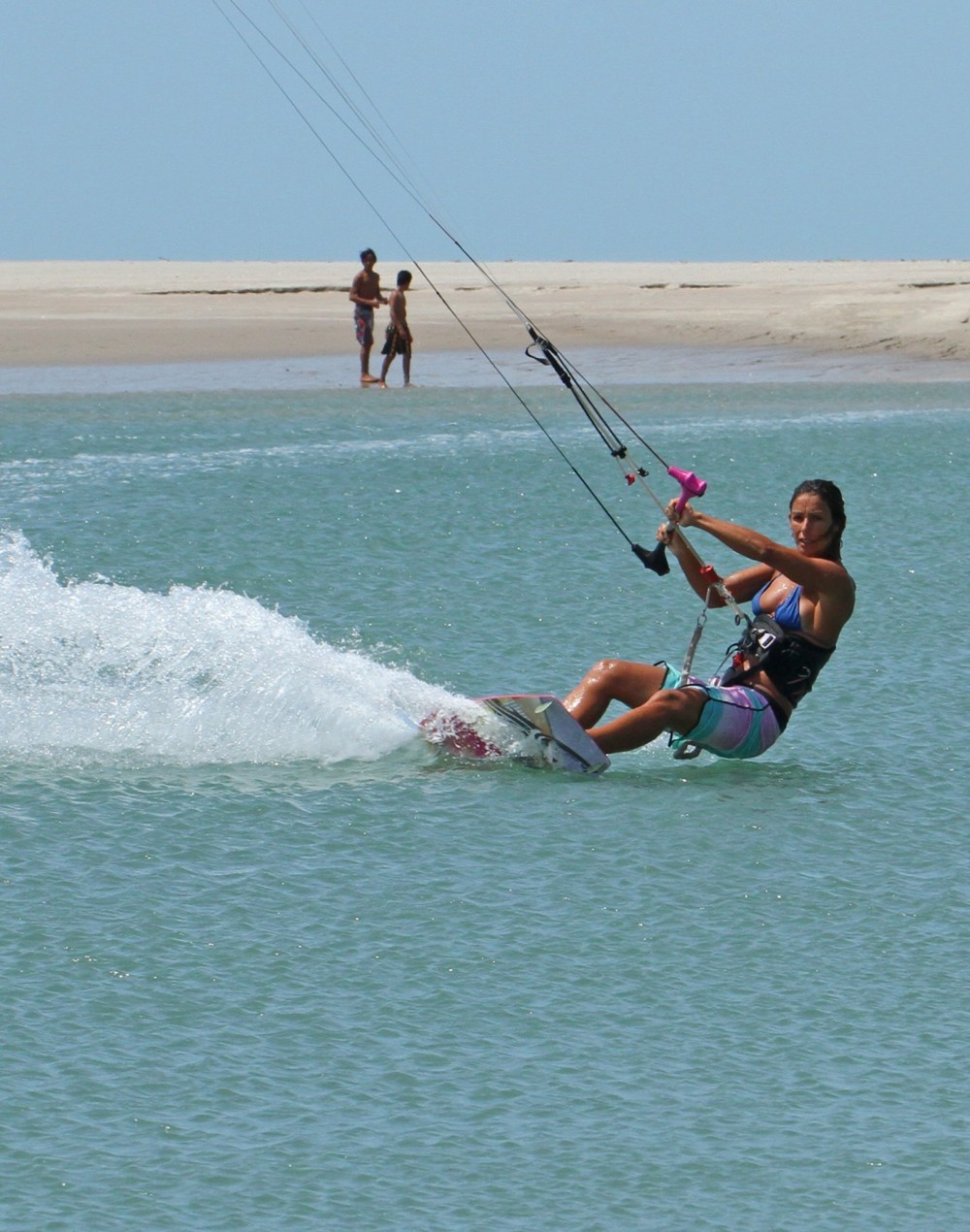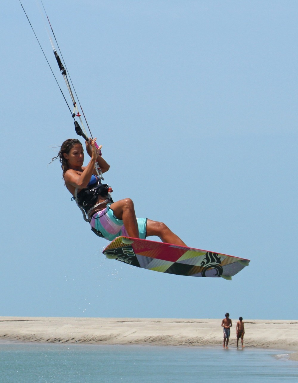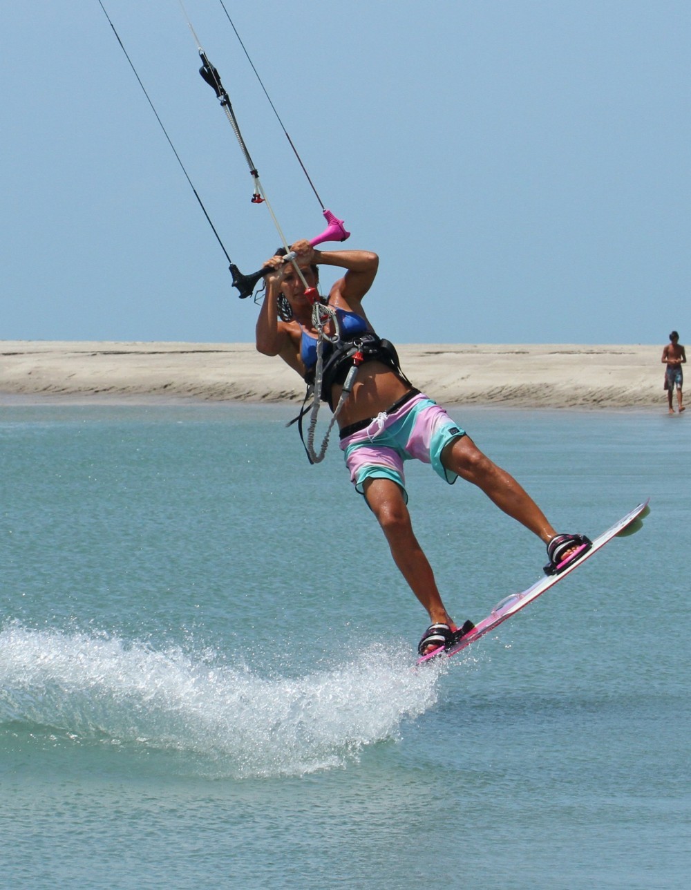 To have the time in the air to get a foot out and still land you’ll need to perform a slow and floaty back rotation. Approach wise you need to be coming in on a good edge with the kite parked at either 11 or 1 o’clock. Get you weight back by extending your front leg and dropping your bum over the back foot, whilst still resisting. You can see that Karine is low to the water and edging hard upwind. From here she can send the kite aggressively with both hands for a decent floaty jump.
