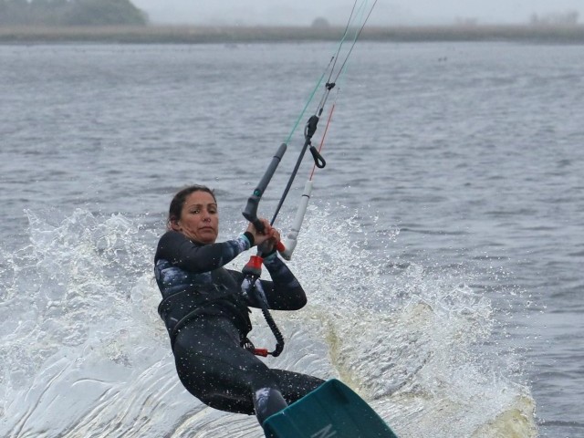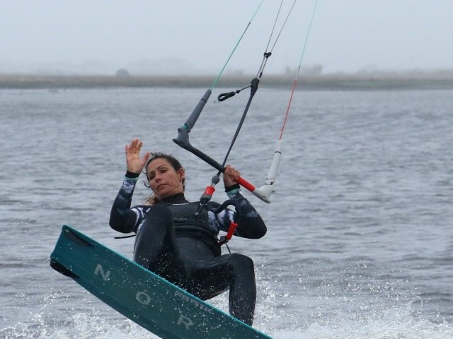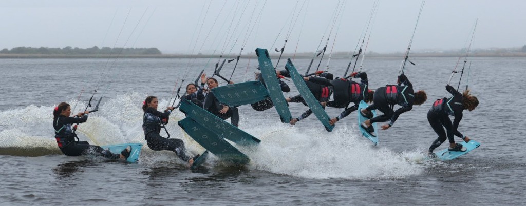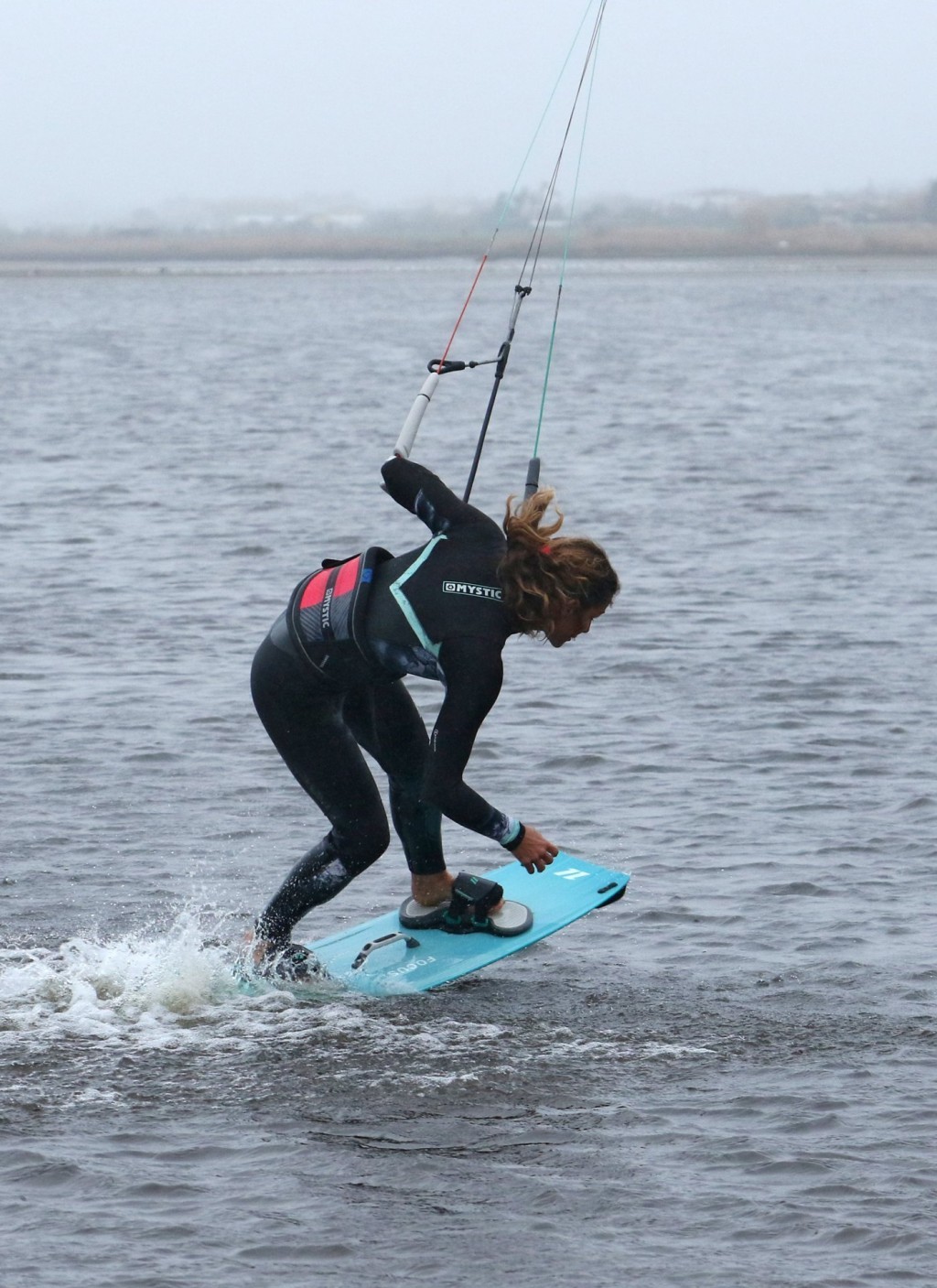 This is very much a continuation of bringing the board through. We really wanted to highlight the landing position. Your goal is to land tail first on a flat board, no edge. However, that’s not all. The open shoulders and head still looking forwards are key to stomping this. Similar to a surf stance, this open toeside stance keeps your speed, projects you forwards, helps keep the kite down and allows you to regain your balance before turning back up onto your toe edge. Once again looking at Karine, her front shoulder is dropped, whilst her back shoulder is up. This puts her in a good position to control the kite with only her back hand – again think body dragging. Her head is looking forwards and her chest is open, not twisted upwind. This keeps her weight forwards and the board planing.