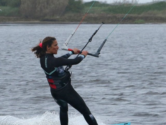 As you’ll be popping, you’ll need to relax your edge on approach, so that you bear away onto a flattish board. At first this is so much easier if you can find a flattish spot of water. By standing over the board you’ll bear away, which moves the kite deeper in the window, so you have something to pop against. It also means that you’ll start your back roll less into the wind, so along with the huge advantage of not grinding to a halt, you’ll have more back roll in the air, and more time to reach the grab. Once again time is relative here, it’ll be over in a jiffy without you contemplating life and the universe. To relax your edge, gently bend your knees, allowing the board to flatten, and then roll yourself up and onto the board. We’ll take out final thoughts here from Karine in the pic. Her hands are centred on the bar, which is trimmed in close enough that she can edge without having to break too much at the waist. Her hips are back over her rear foot, so she’s on the carvey tail of the board and her kite is parked around 1 o’clock. From here she can gently drift the kite by steering it up nice and slowly, whilst dropping her bum and looking back up wind, to start her carve.