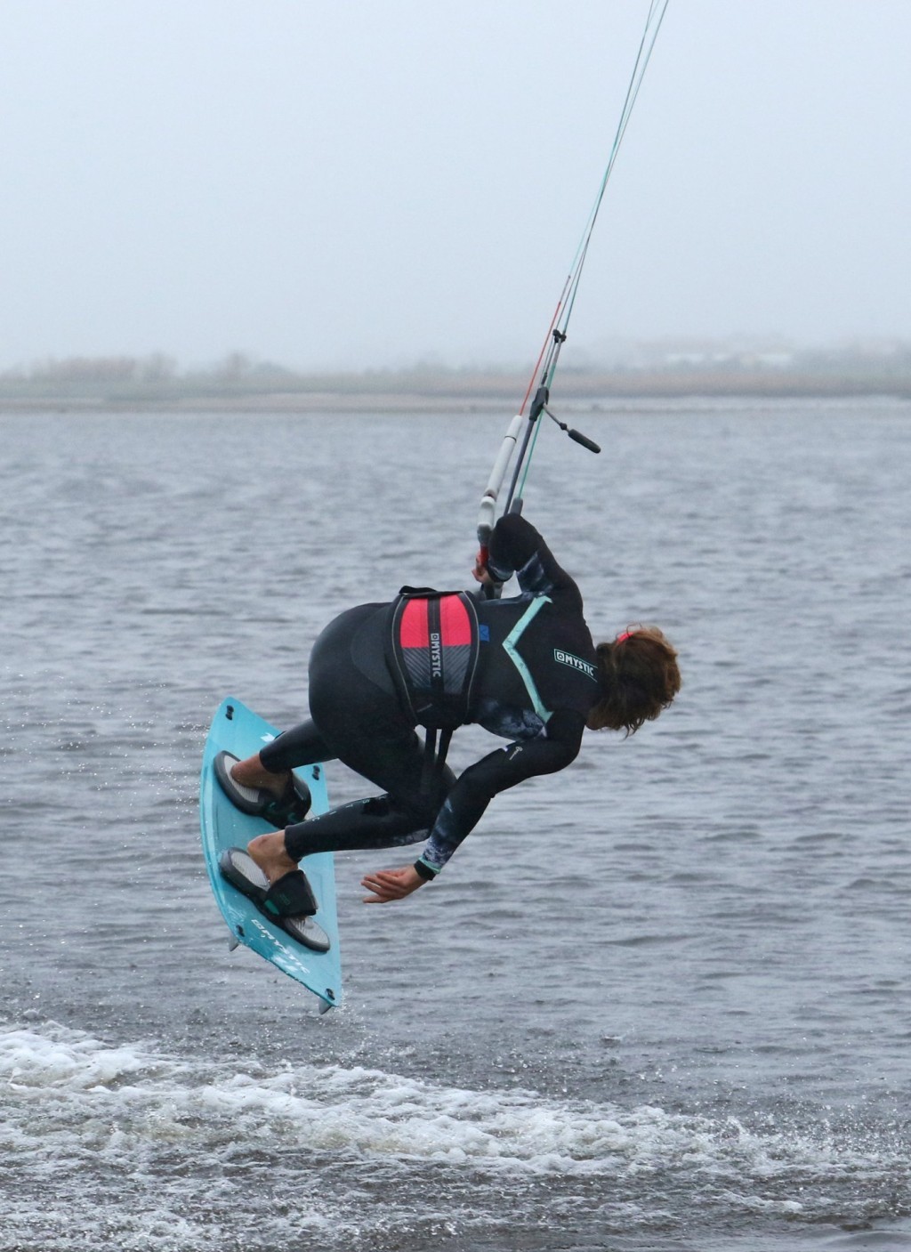 As preluded to, time is relative, and as such, even with a good take off, in short supply. As soon as you’ve stamped off you need to fire straight into getting the board up close and get ready for the grab. The good news is, as you’ll be grabbing the heelside edge near the nose and your explosion for take-off comes from your back leg, you can focus on and prioritise bringing your front knee up. Not only will this help you grab earlier, but it’ll also make the grab easier. With the back leg slightly extended the nose will actually be nearer. However, it’s very easy to focus on your take off and not immediately bring the board up and compress. You’ll also need to free your front hand and start going for the grab. This will only be possible if you look where you want to grab. Another good reason not to throw your head. The final key point here as demonstrated by Karine, is keeping the bar in. This way the kite will support you as you rotate. Let it out and you’ll drop. Be warned though, if your sweet spot is miles out and you pull the bar right in, you’ll stall the kite, and this will also drop you.