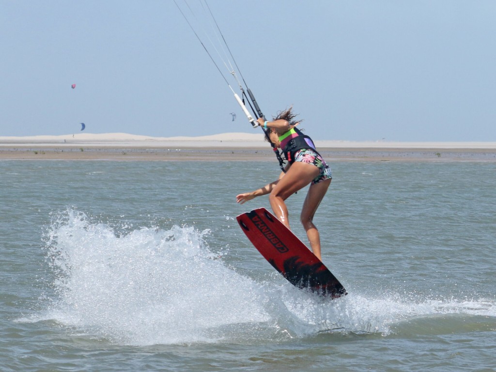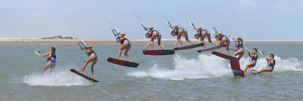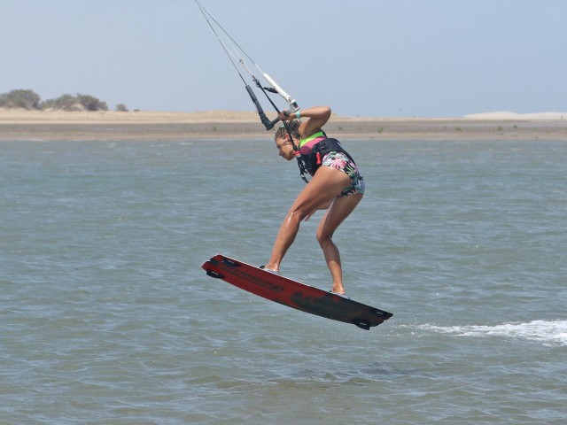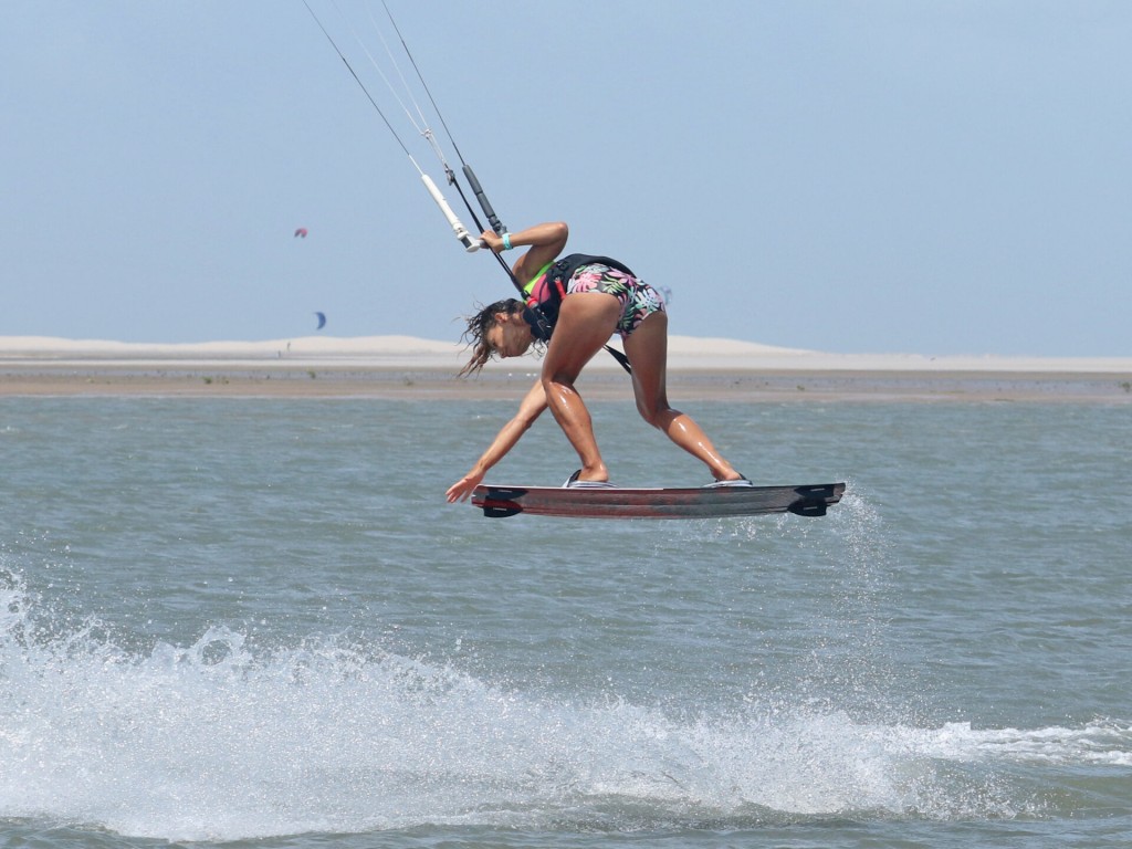We say this for every pop move, you have to make it happen and you decide when it happens. If you wait for something, nothing happens! For this move you want a mean pop so that you can get into a shifty-esque position. That’s why your approach and carve are so important. Get them right and you’re in the perfect position to stamp against your board and pop yourself off the water. You can see her that Karine’s rear leg has extended, she’s given it 180% against her back leg. Timing wise it’s better to pop too early than too late, or else you’ll slow down too much. As you pop, leave the bar on the sweet spot, don’t pull. You’ve got enough on your plate resisting against your carve without having to deal with extra pull from the kite.