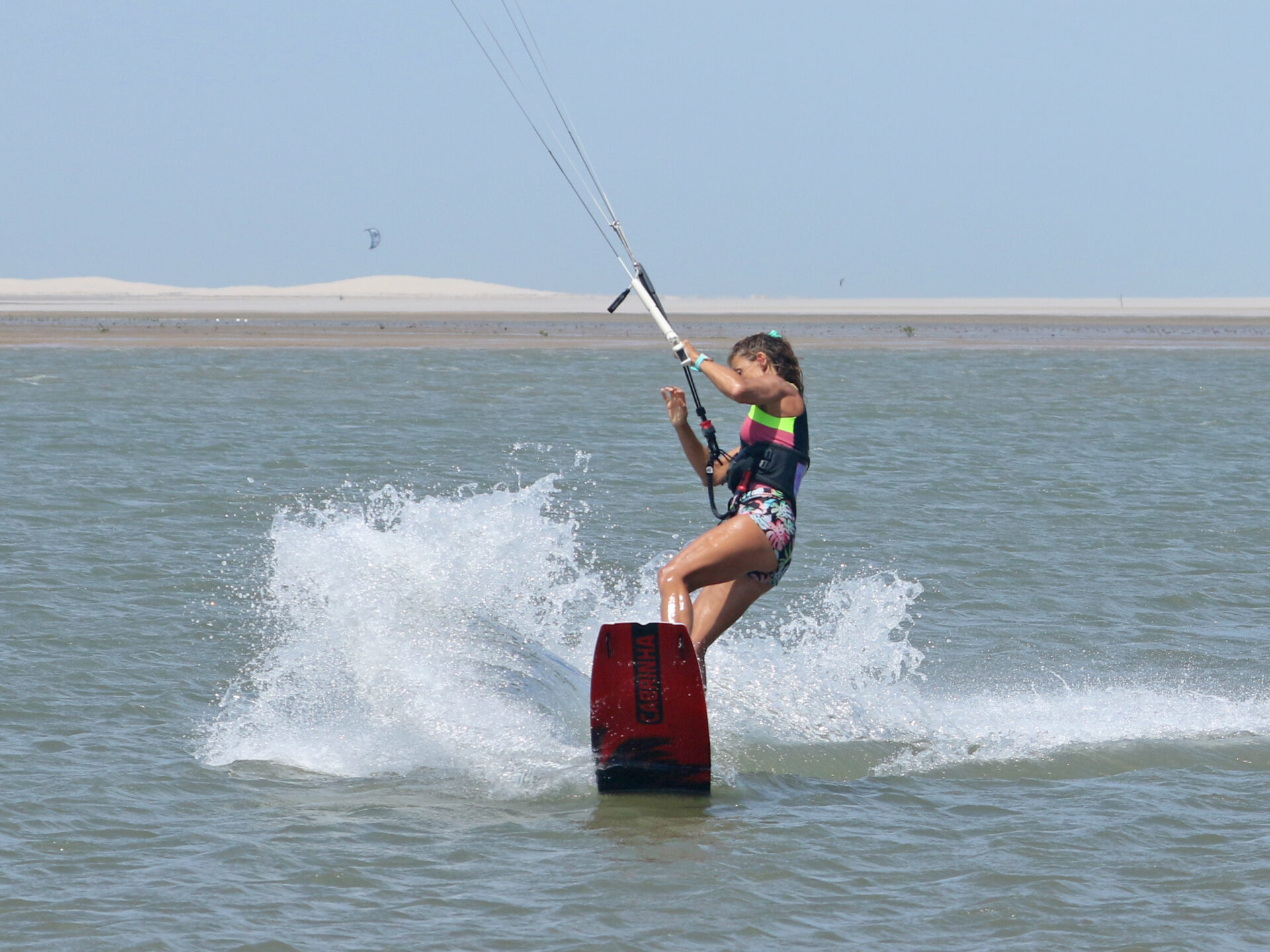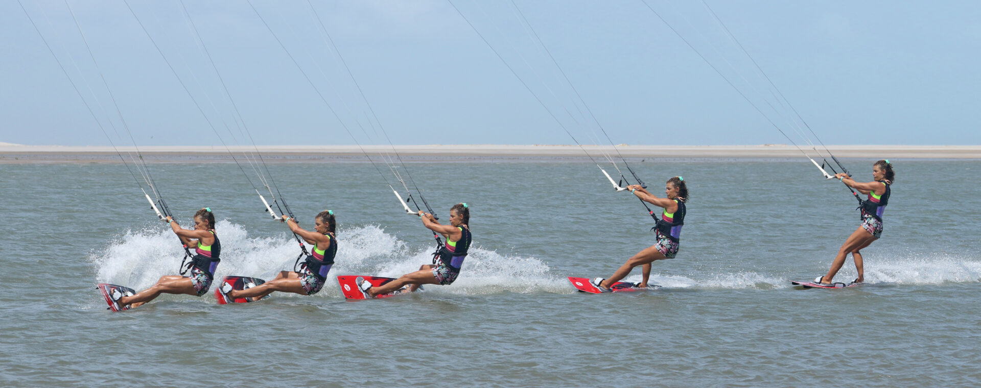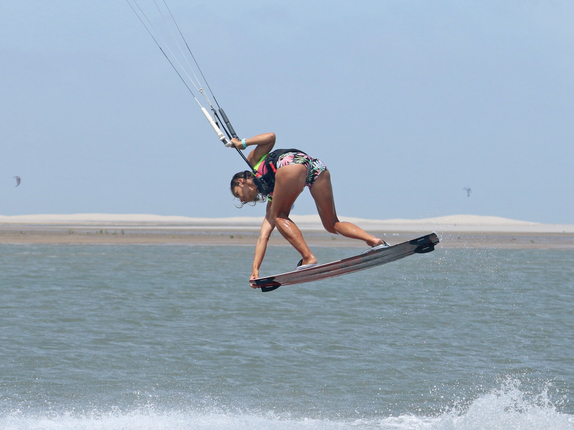 We say this for every pop move, you have to make it happen and you decide when it happens. If you wait for something, nothing happens! For this move you want a mean pop so that you can get into a shifty-esque position. That’s why your approach and carve are so important. Get them right and you’re in the perfect position to stamp against your board and pop yourself off the water. You can see her that Karine’s rear leg has extended, she’s given it 180% against her back leg. Timing wise it’s better to pop too early than too late, or else you’ll slow down too much. As you pop, leave the bar on the sweet spot, don’t pull. You’ve got enough on your plate resisting against your carve without having to deal with extra pull from the kite.