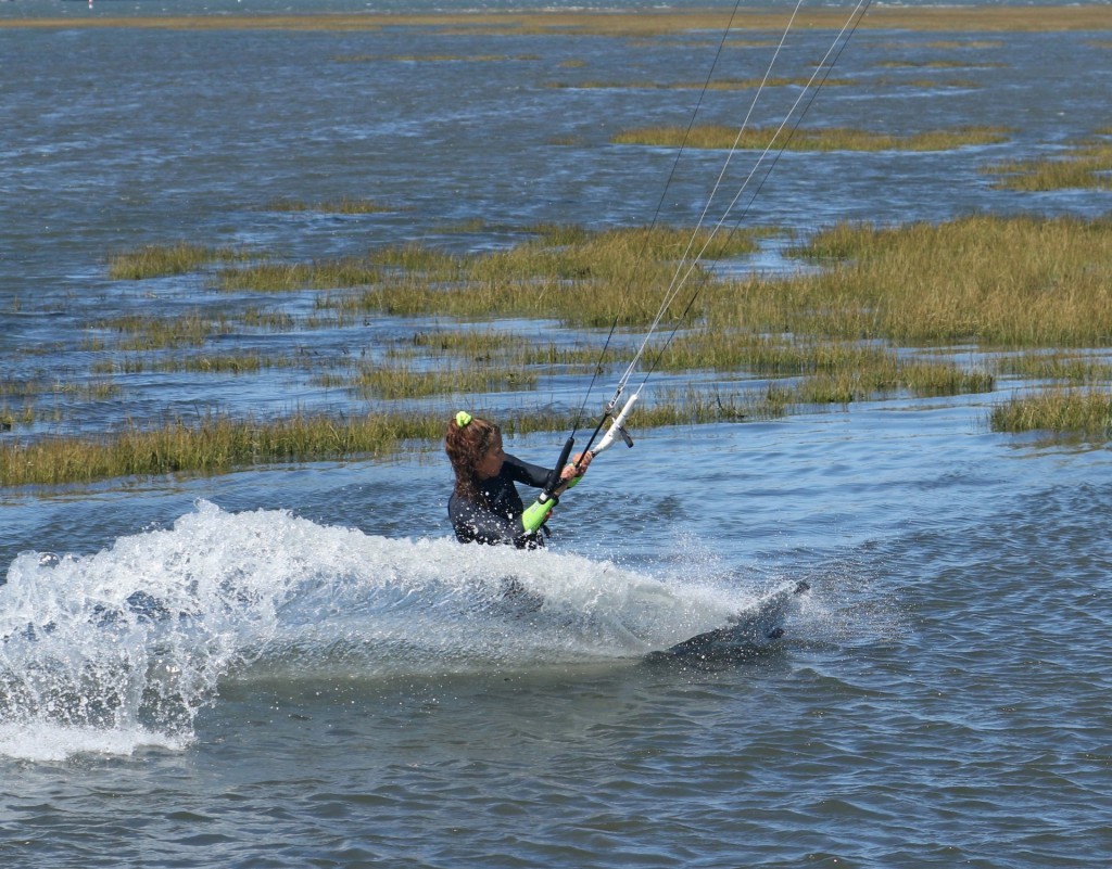 As we alluded to in our popping piece, carving up is turning back onto your edge using the curvy shape of your board. However, the tools will only do so much, whilst you, the craftsperson, are saddled with the rest. The carve is important for two reasons; it enables you to regain tension so that you have something to pop against, and it initiates your back rotation. So, how do you carve up? In simplistic terms, you’re turning the board back onto its edge whilst keeping your weight back. However, it’s all in the way you get your weight onto that edge that matters. Your aim is to drop your edge deep into the water whilst banking your board over so that it’s resisting again. The first part is fairly intuitive as you can turn upwind using your head, shoulders, hips and feet. To make sure you have resistance, you also need to drop your bum whilst keeping the board between yourself and your kite. You can’t sit down as this will flatten the board. You need to hinge at the hips so that your bum drops away from the board, enabling you to push against it. This is why you need your bar trimmed close enough, otherwise you’ll end up with your shoulders forward, bum back, and you won’t have a hope of popping. Karine is carving back up, her weight is back, her kite is still at 11 o’clock, and, although she’s hidden by her rooster, you can see that her bum is way upwind of her board, and as such she can apply pressure through her back leg. One final point to add and live by: Don’t pull on the bar as you carve! If you do, you won’t be able to carve upwind enough to initiate your rotation.