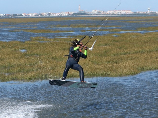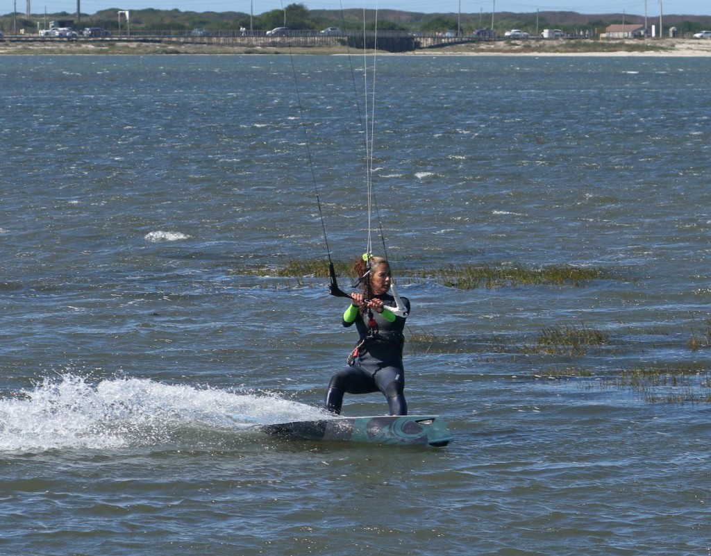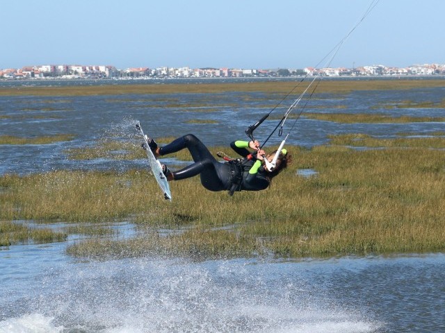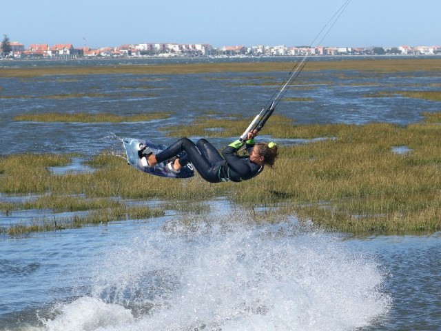 This is it, the moment of truth. The pop doesn’t just happen, you have to make it happen. Popping is stamping, explosively extending your back leg. The idea is not to give into six million years of evolution and bend your legs in anticipation, but rather use the bend in your legs that you have as you carve up. If you bend, you’ll lose your edge and all that tension. The main impetus is coming from your back leg, but the front will automatically assist. You also need to think slightly ahead, in that you’re aiming to rotate. This means that as you pop you want to continue carving, like a follow through after kicking a ball or a racket stroke. Keep carving by turning your head, shoulders and hips to look upwind and drop your shoulders back. Once again, the tail of the board will do its job. Timing wise, you need to stamp before you slow too much. This is balanced against turning enough to get your rotation. The stamp is a full-on extension and even though your weight is back on the board, aim to kick yourself up, rather than throw yourself around. Whilst all this is going on, your challenge is to keep the kite still. As per the pop, make sure you kick before you pull on the bar. In the photo, you can see how Karine has carved well into the wind before exploding up off her back leg. Notice how everything is turning together. Her board, hips and shoulders are all aligned.