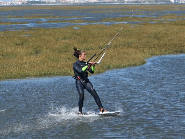Your approach and set up are vital, as are the conditions. Search out some flattish water if you can, as it’ll up your chances, but make sure it’s deep enough for a soft bail. Just as per popping, trim your bar so that it’s easily reachable when you have your bum low, get your hands centred, and approach on an edge across the wind. Move your weight and hips back to get on the curvy tail of your board and drive through your back heel so that you can feel the pressure in your leg; this is your default popping stance. Looking at Karine, you can see that she’s edging, but not massively upwind. Even with her weight low, her bar is within easy reach. Her hips are back so that she’s on the curvy bit of the board. With her kite parked at 11 o’clock, she’s locked and loaded.