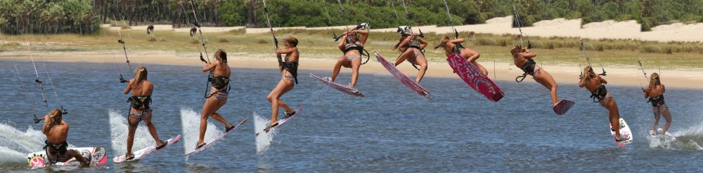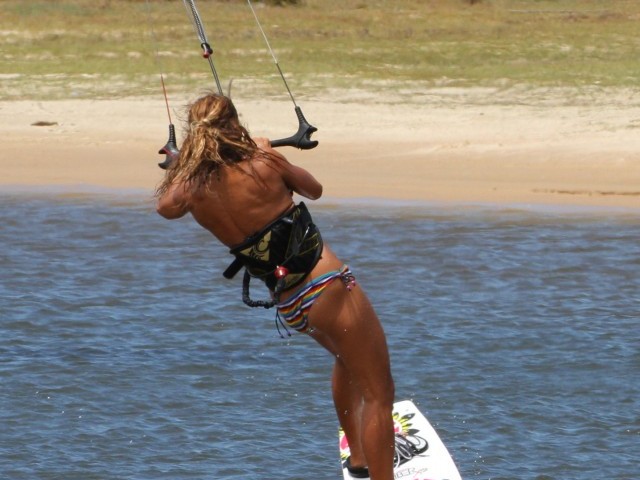 - Pic 2. Without using the kite Karine explodes up off her back leg by stamping aggressively with her back foot, kicking against the board.