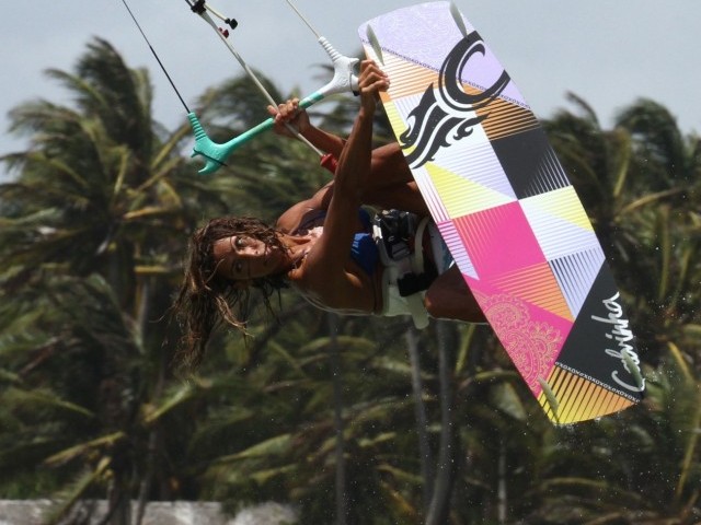 Pic E. With her grab held Karine turns her head to spot the landing. To speed up her rotation she has pulled both knees up whilst still holding the bar in, keeping the kite moving forward and pulling.