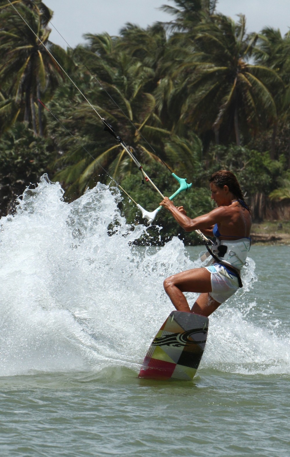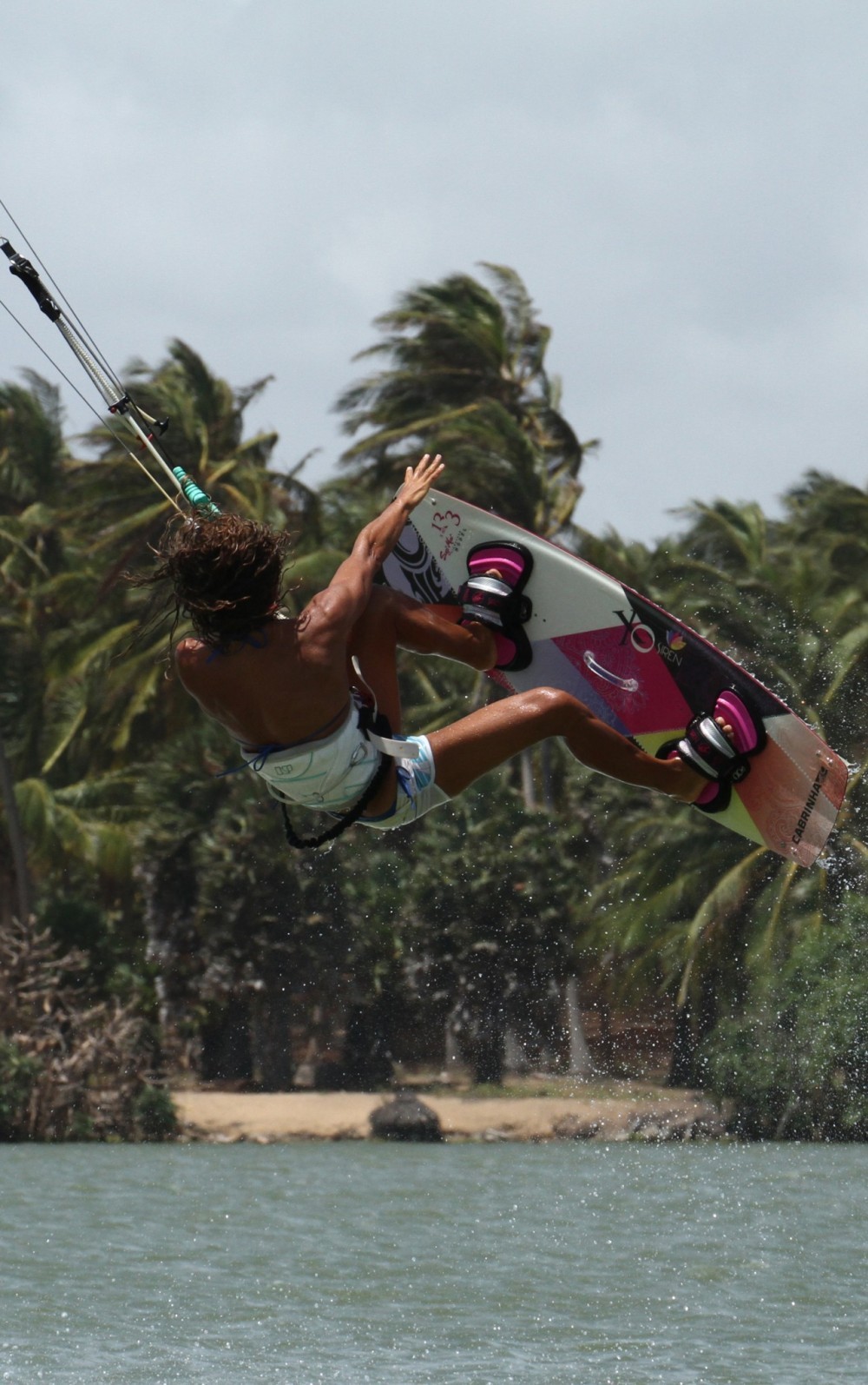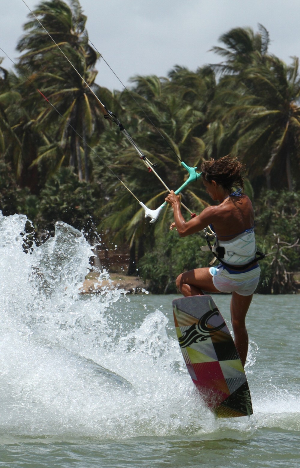 Pic C. Karine is just off the water and she already has her front knee up and across in front of her. She resists the temptation to pull her back leg up and keeps it straight - with it extended the nose of the board will tip even closer to her. She allows her head and shoulders to tip down and forward into the rotation as she fully extends up and keeps the bar pulled in. Her back hand is reaching down towards the already well-positioned board.