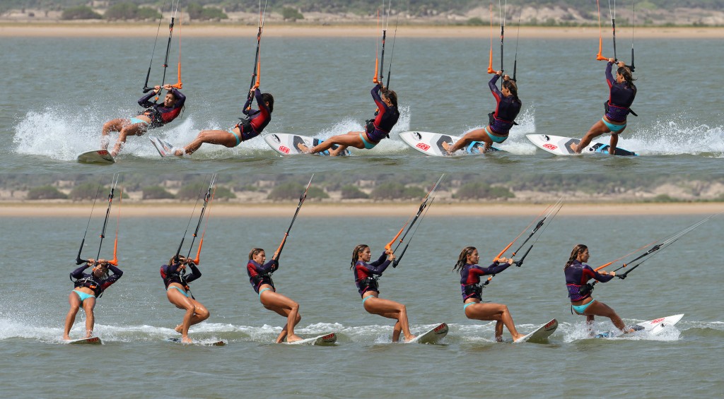 After getting the kite up to 12 and letting the bar out, this is probably the single most important part of the roll tack as you need to carve the board much further through the wind than a tack. You need the board already facing upwind in the other direction to pull these off time and again, and it’ll only get there if you put it there. With her bar out, the kite will not pull, and as such Karine can carve further up and through the wind. If you look at Karine’s feet and ankles, they are driving against the rail of the board, carving it up. Both her knees are flexed and turning to point upwind. Yet again this keeps weight on the whole the rail, carving the board up whilst maintaining some speed and momentum. If her front leg was straight she’d be pushing too much through he back leg and the nose would rise, slowing the board. If her front leg was too bent, all her weight would be forward and the fins would slide out. It’s all about finding the balance, and foot placement is a big part of this, which will change from board to board. Finally, Karine’s head is still fairly perpendicular to her shoulders, she has not thrown it over her front shoulder, as this would pull her away from the board.