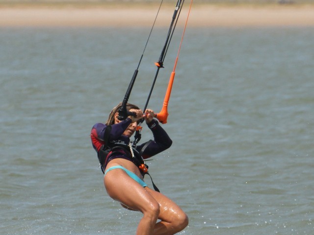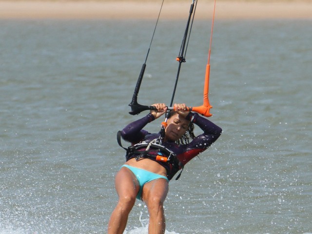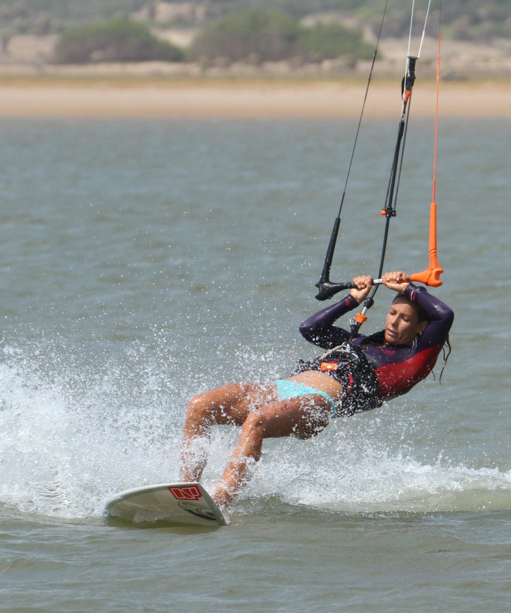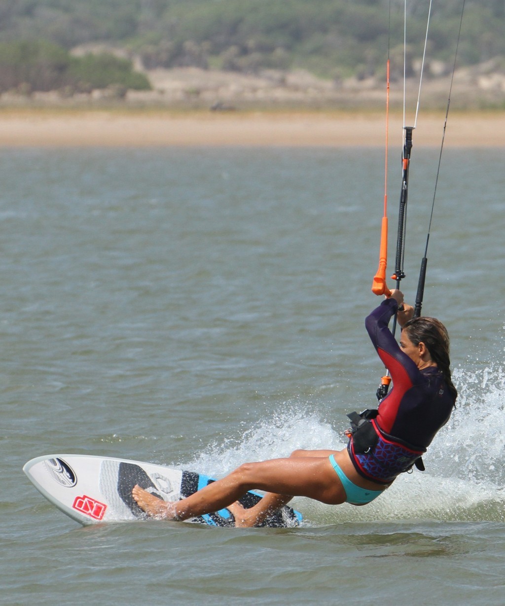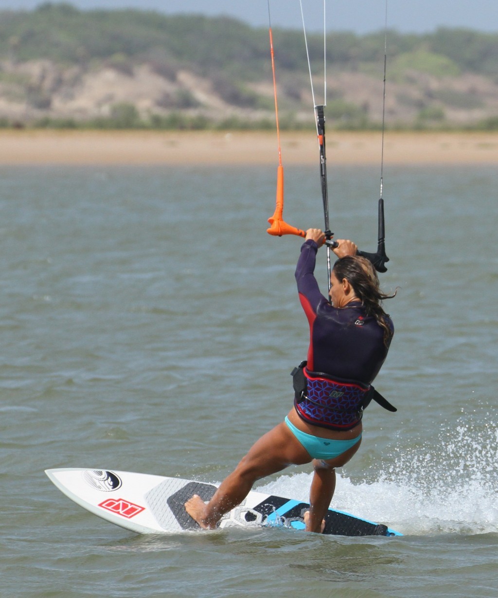 With both feet where they belong and the kite diving and pulling, Karine can now move her weight over her back foot, lifting the front of the board, and then push the nose of the board off the wind with her front foot. Job done.