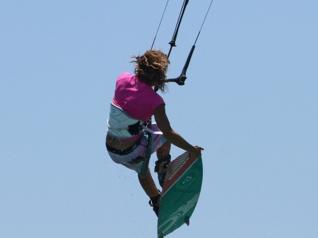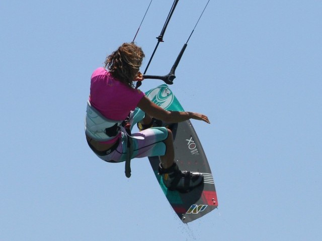 As soon as you can it’s time for the nose grab. With the kite back you will be able to lean back and get yourself into position as per normal. Karine has lent back, keeping the bar in. She has lifted her front knee up towards her chest and twisted it across towards the right side of her body. At the same time she extends her back leg, pushing her back foot away from her. These two movements place the board’s nose handily in front of Karine so that she can reach forward and grab the nose. Once she has the nose Karine will keep hold of it until she reaches the apex of her jump, or she feels the kite flying forward and up to 12 o’clock.