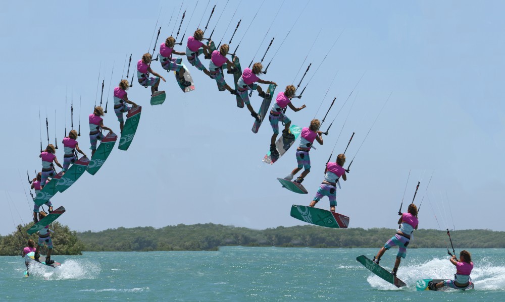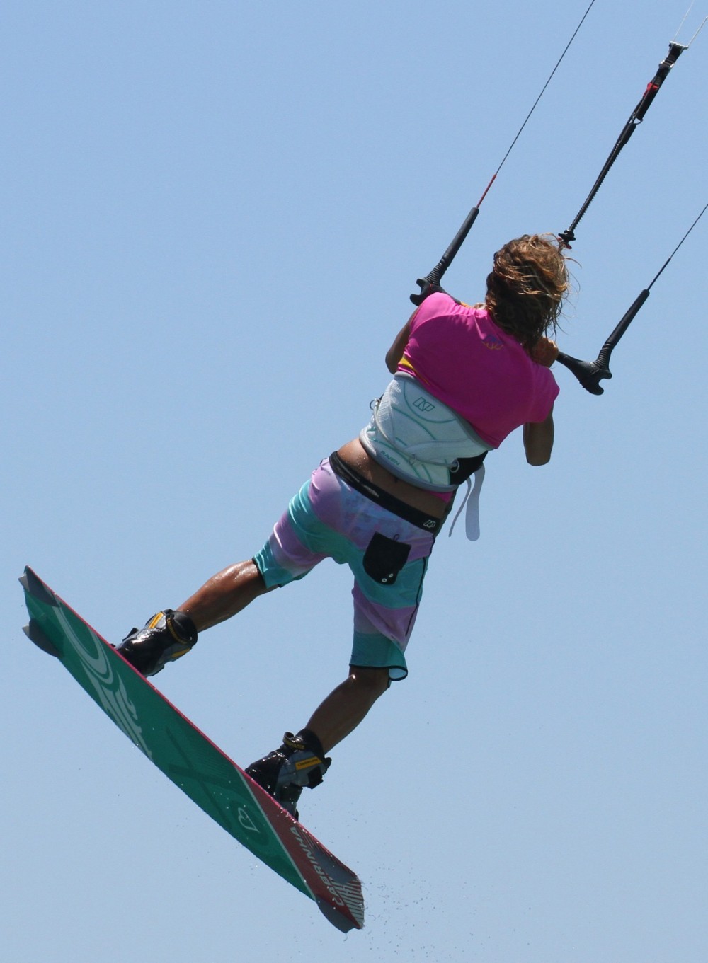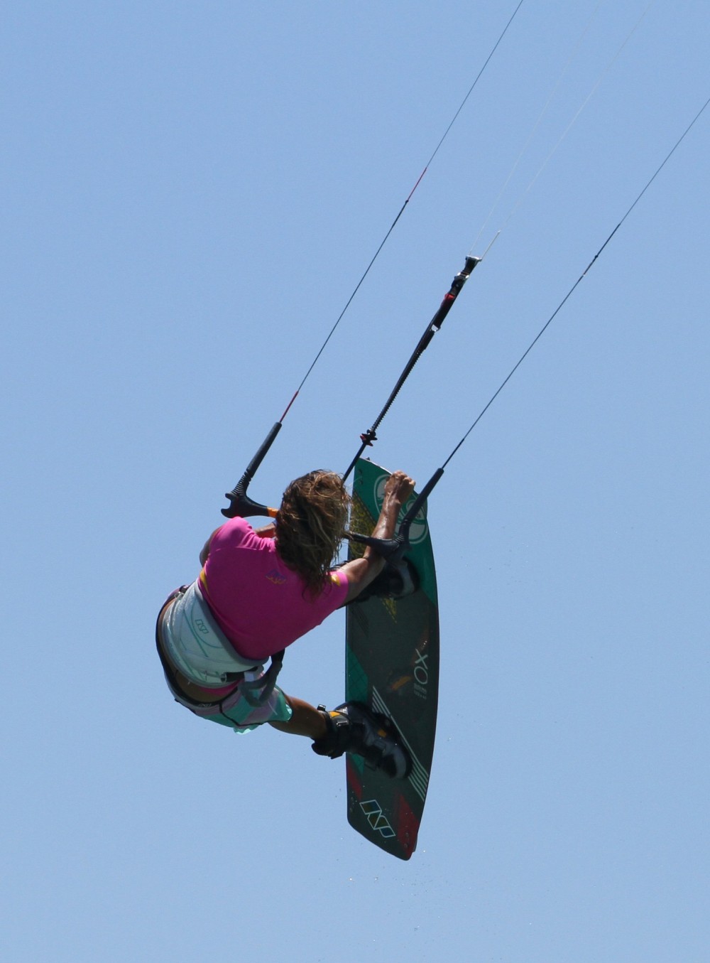 It goes without saying that if you want to squeeze in a couple of tweaked grabs you’ll be needing some airtime. This means that you’ll require a decent edge and a hefty send. Make sure that your kite is not above 11 or 1 o’clock so that you’ll get the pull early enough, and get on that get home edge so that you’re pointing high with maximum tension on the lines. You can see that Karine is fully on her edge and has plenty of spray to prove it. In this position she can send the kite aggressively with both hands, keeping the bar on the sweet spot and aim for decent height and hangtime. Also as a footnote, do make sure that your hands are centred on the bar so that you can grab away to your hearts content without any unwanted kite movements.