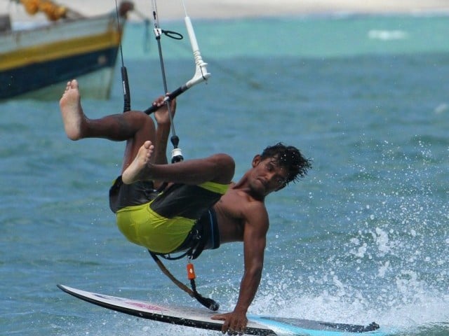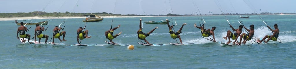 This is the crucial moment, get this right and your chances of success are rocketing. Your signal to go is the lift from the kite. As you feel it lift you must start your rotation and look to make contact with the board. You can see that Heliarde has the bar in for support. To start the rotation, he reaches his front hand down, rocking forwards on his front foot whilst lifting his back foot, turning his hips forwards. This movement forwards into the back roll guarantees that he’ll make contact with the board early. It’s easy to throw yourself backwards into this, blindly groping for the board, but if you move forwards you won’t waist any lift and the move will be more controlled and as such more consistent...