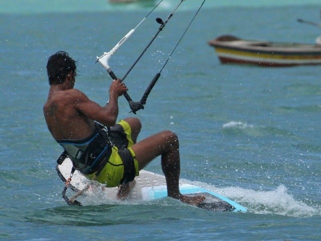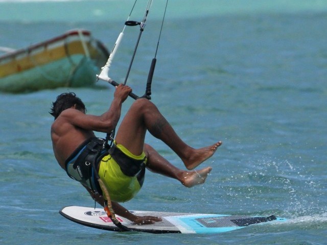 Always a good place to start, the set up here is equally important as any other form of showboating. First rule of thumb for any support move is that you need lift in the kite, and therefore you need tension in the lines. Best to have your sweet spot trimmed out a tad. Approach with your kite at either 11 or 1 o’clock so that you can maintain a good edge and you’ll want some speed too, as this will keep lift in the kite for longer. Your feet want to be comfortably wide enough on the upwind edge of the board, and get your back hand centred on the bar. In Pic A you can see that Heliarde is doing all of the above, as the more lift that he has, the longer the kite will hold him and the more support he’ll have.
