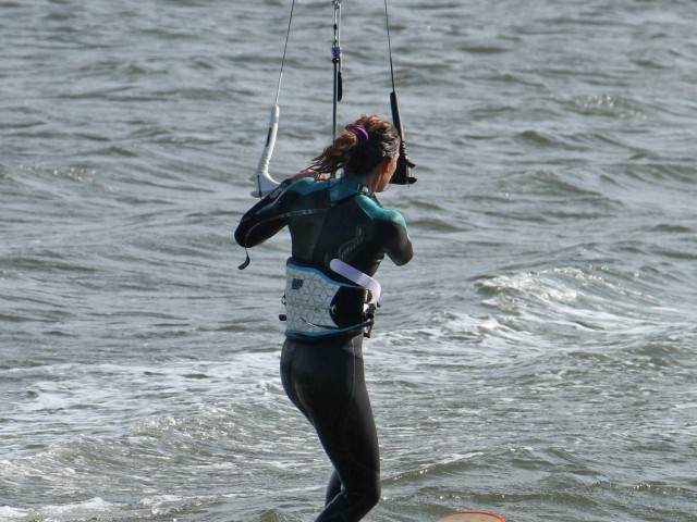 As the power comes on, the fins should do their job and pivot the nose of the board off the wind and towards the kite, so that you’ll be moving again and ready to ride off into the sunset feeling rather pleased with yourself. The only precaution, as you can witness in the photo, is that your feet, just as Karine’s, will not be in the optimum place for a strong toeside edge. They’ll still be on what was the upwind rail, so you’ll need to shuffle them across slightly for a better toe side;)