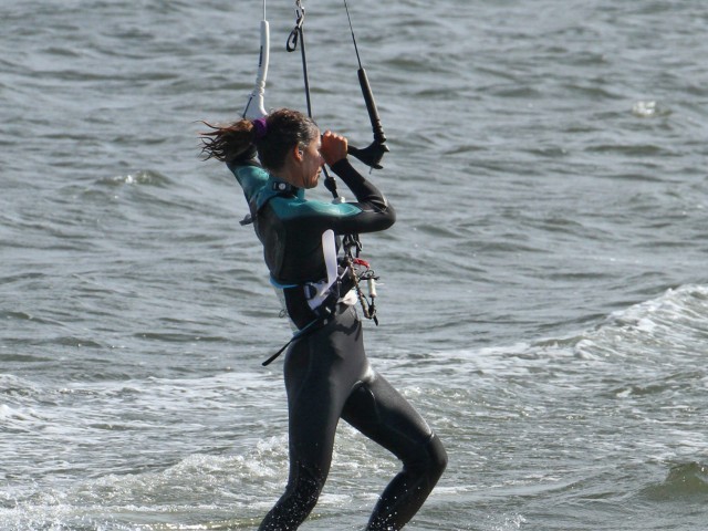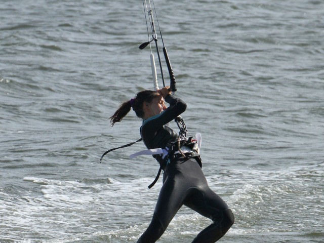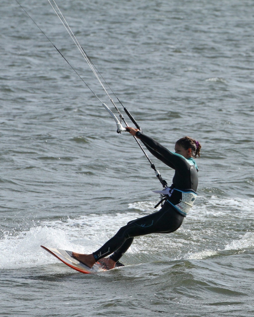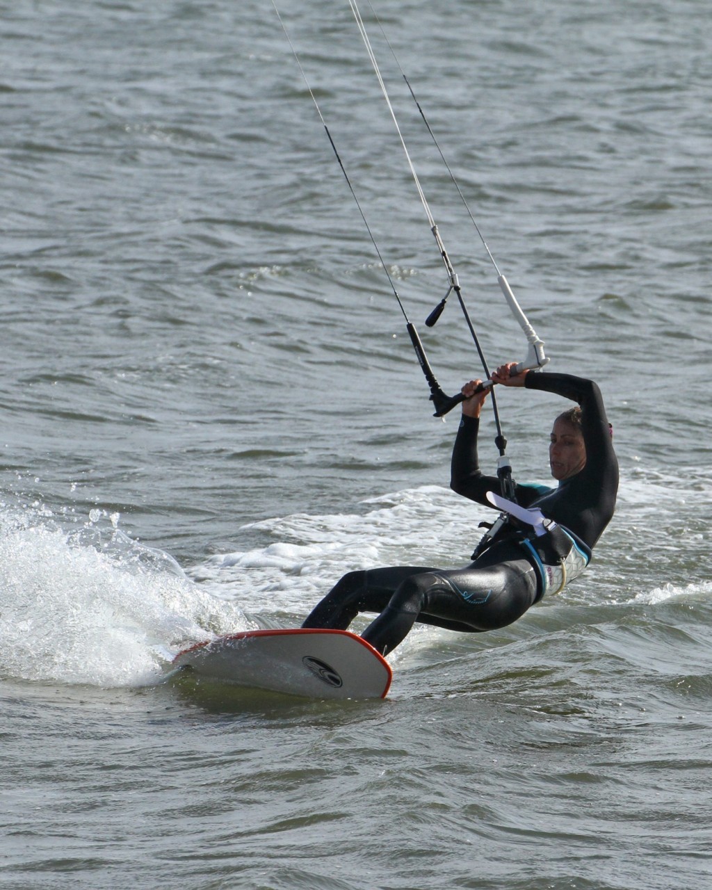 OK, this is the bit where it looks like you need to have been some form of gymnast or acrobat, with bendy ligaments and supple joints who always won the holiday limbo competition on animation night. Despair ye not. This may appear contortionistic, but it’s not. Once again, the video highlights this movement well. With the nose of the board through the wind, you’ll find yourself hanging from your bar, which if level will support you, but not for long. What you need to do is get your weight and centre of gravity over the board and onto your feet. Up until now you’ve been pushing against the board, now it’s time to relax. Stop pushing and let you knees go soft so that your hips can roll over and above the board. With your hips over the board, you can actually put weight back down onto your feet. In the photo Karine has the bar pulled all the way in, whilst keeping it level. She stopped pushing, collapsed her knees and allowed her hips to swing over the board. This will give you a few more nanoseconds.