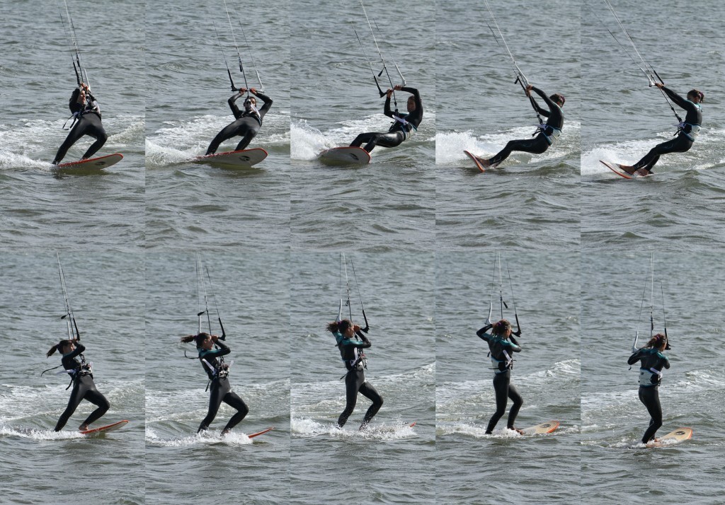 Once again, the carve should be similar to that of a Tack. The only difference is that you want to get the board further round, through the eye of the wind. This means sitting your weight onto your heels and driving the board up into the wind, breaking at the waist to keep weight on the board and leaving the bar out, with the kite stationary at around 12 o’clock. What happens next is the new bit. If we look at Karine we can see what you need to add. As the nose of her board approaches the eye of the wind, she will start to lose support from the kite and her upper body is “falling” towards the water. To stop this and enable her to keep carving (which you’ll see clearly in the slow motion video) she pulls in on the bar for support which enables her to carve the board a bit further. One last movement to note is that Karine is looking at the board, towards her front foot. Do this to prevent yourself from twisting your upper body, which would then stop you carving with your legs.