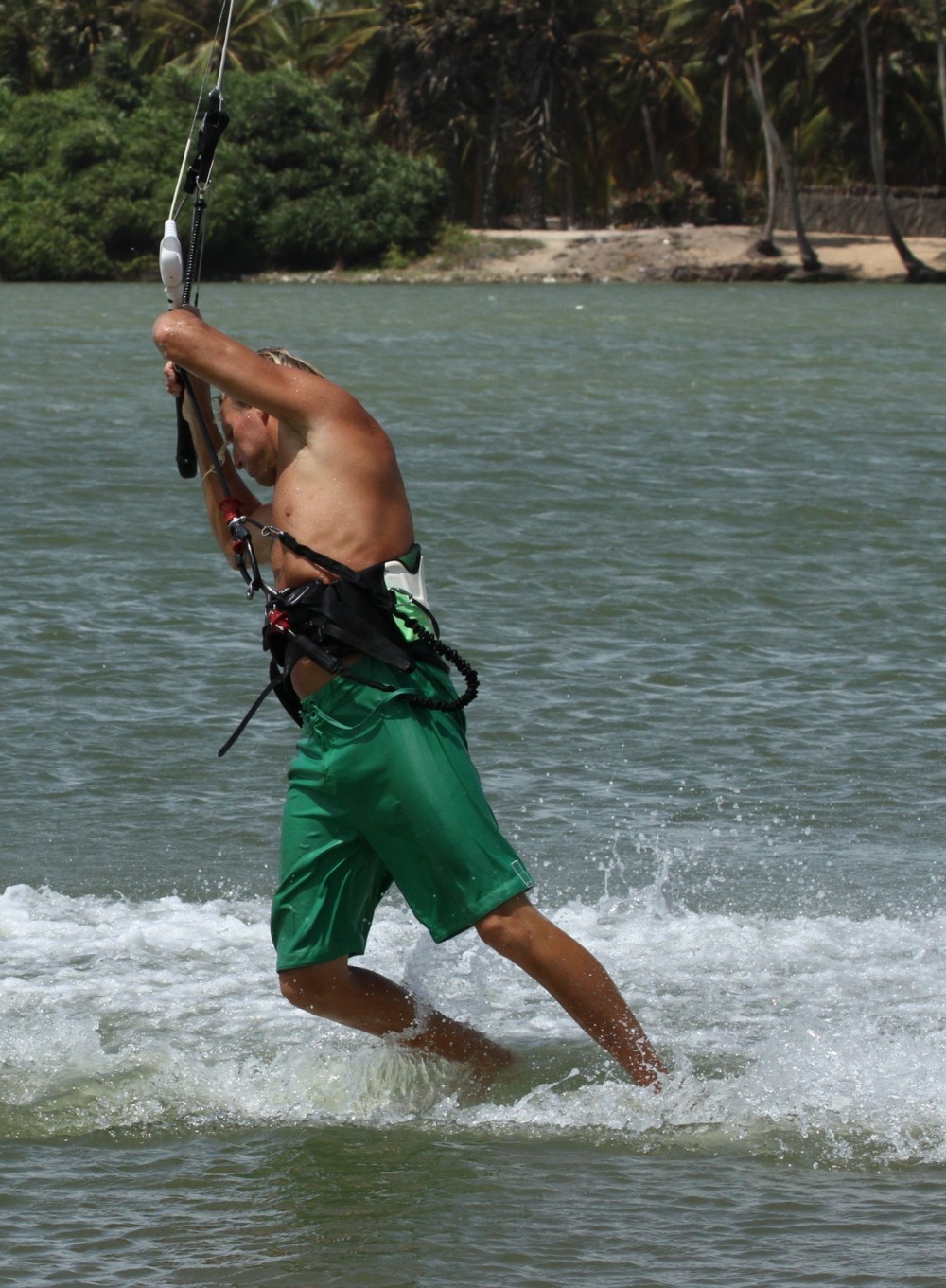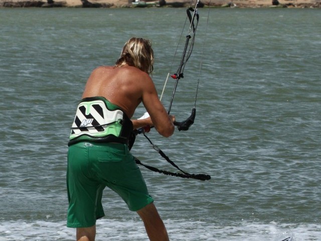 Now that you’re balanced-ish, you need to get the bar to the other side, so that it’s leading you, and get you weight back towards the back leg. The movement is similar to a duck tack without moving the feet, or an Ole. You’ll need to dump all tension from the lines so that the kite doesn’t pull you so that you can man handle the bar across. As the bar moves you should follow it with your head and shoulders, but don’t spin your body or else you’ll loose your balance.