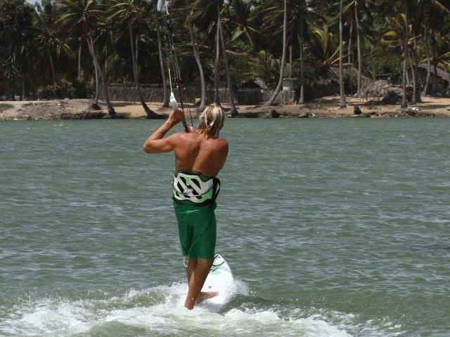 In the picture Christian has got the tail dead down wind so he now goes into slide mode, which is simply a matter of getting weight onto his front foot so that he’s balanced over both feet. You can see that Christian’s back leg, the left one is now straight and his right leg is bent, as he’s moved his hips and therefore his weight forward. This will momentarily turn your surfboard into a skimboard, tea tray or block of ice, whichever analogy you prefer, and the board will start to slide, continuing the way you instigated with the carve, and thus turning your back towards the kite. The beauty however is that the board won’t have to slide far before it realises that it is a directional, the fins will bite and the board will hopefully end up pointing across the wind in the direction of travel – nose first.